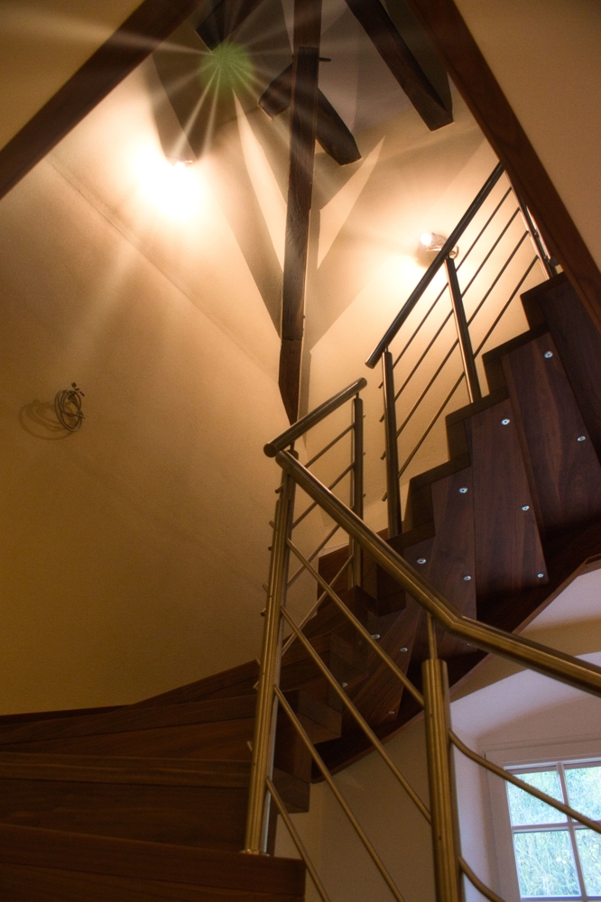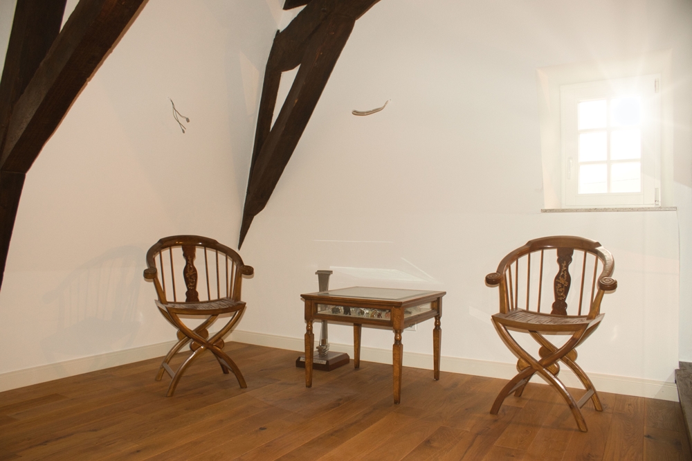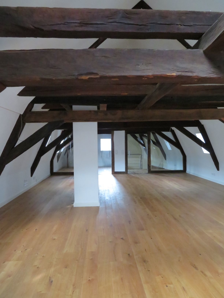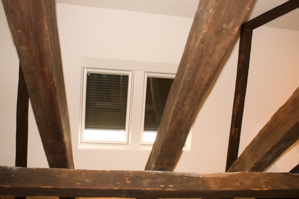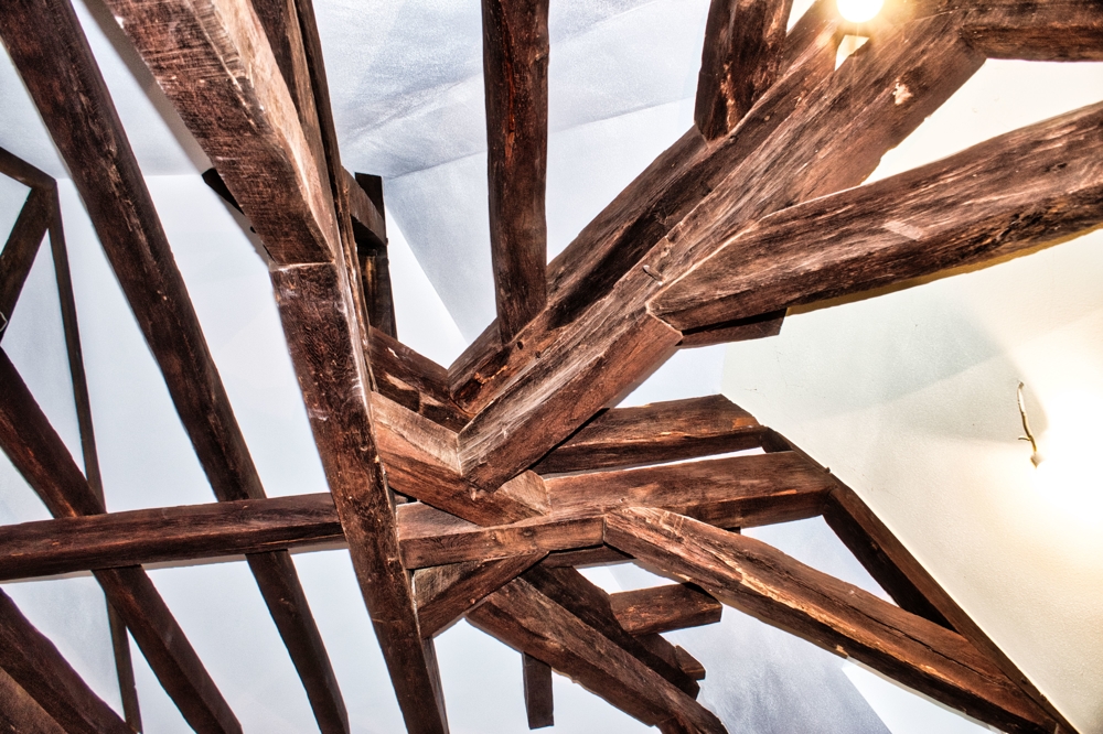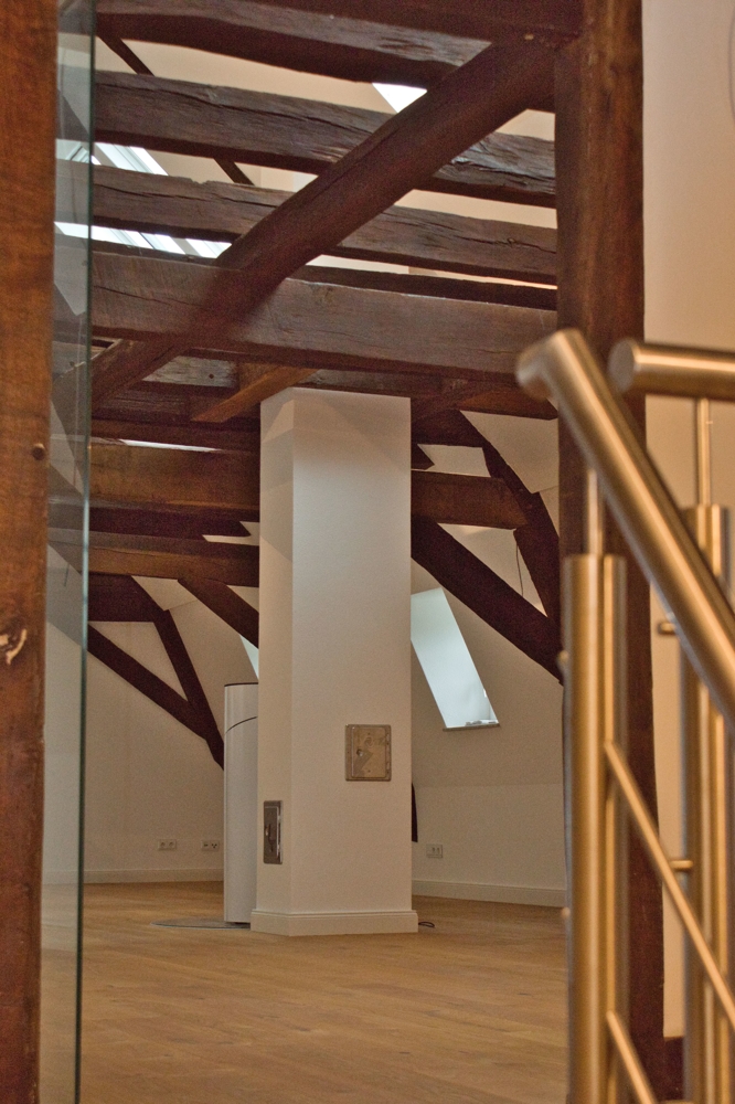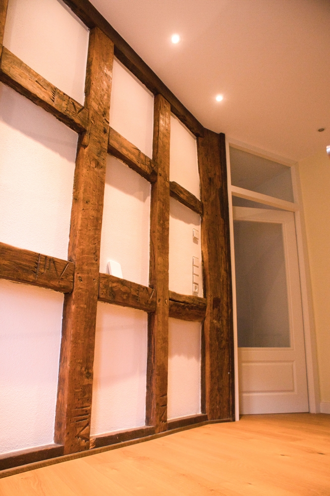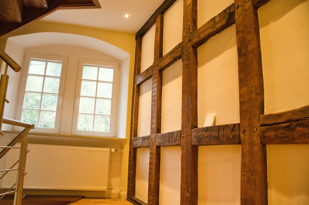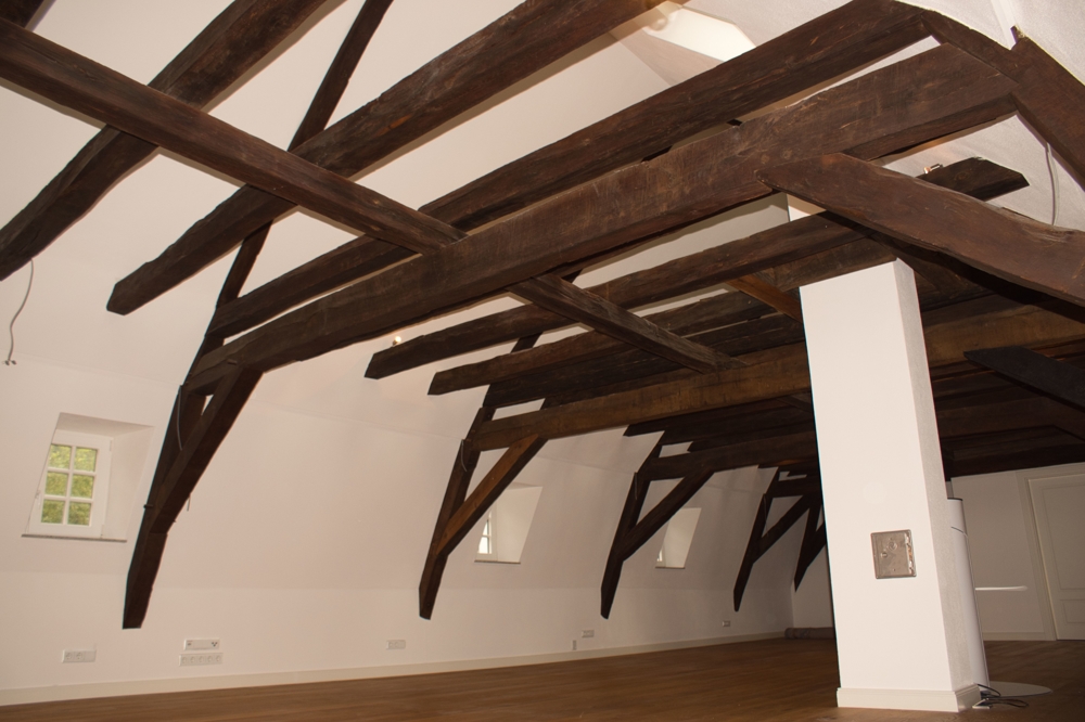 Das Innere des Gebäudes wurde komplett neu aufgebaut und erhaltenswürdiges Gebälk freigelegt.