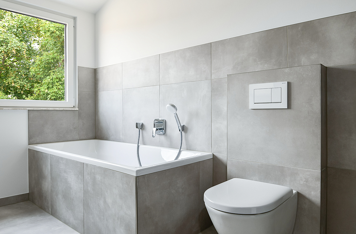 + Tageslicht-Badezimmer mit hochwertiger Badewanne, Waschbecken, Regendusche und italienischen Fliesen