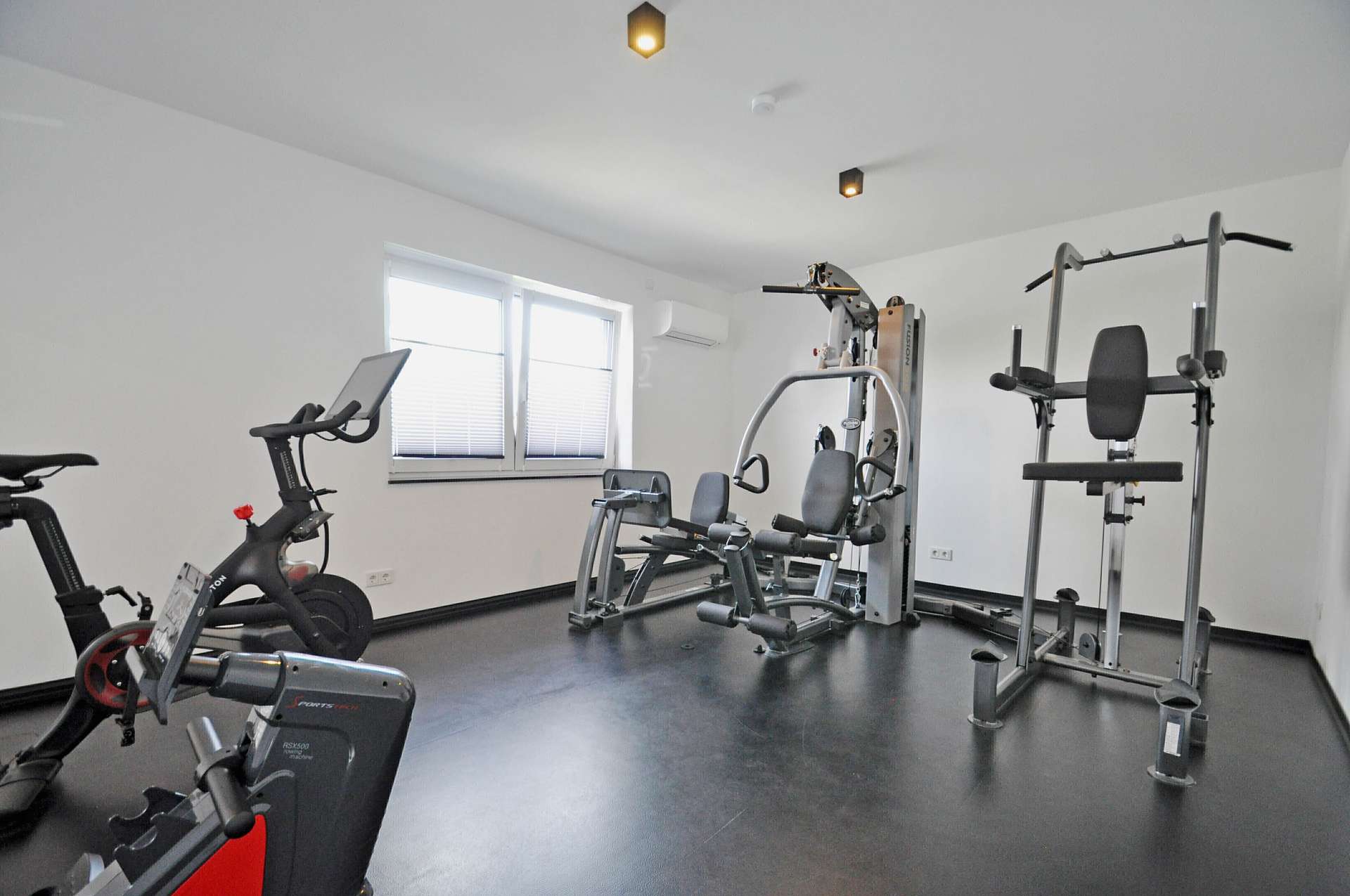 Ein separates Gäste-WC, der stilvolle Saunabereich mit eigenem Duschbad und direktem Zugang zur Terrasse, mehrere Abstellräume sowie der Technikraum runden das Untergeschoss ab.