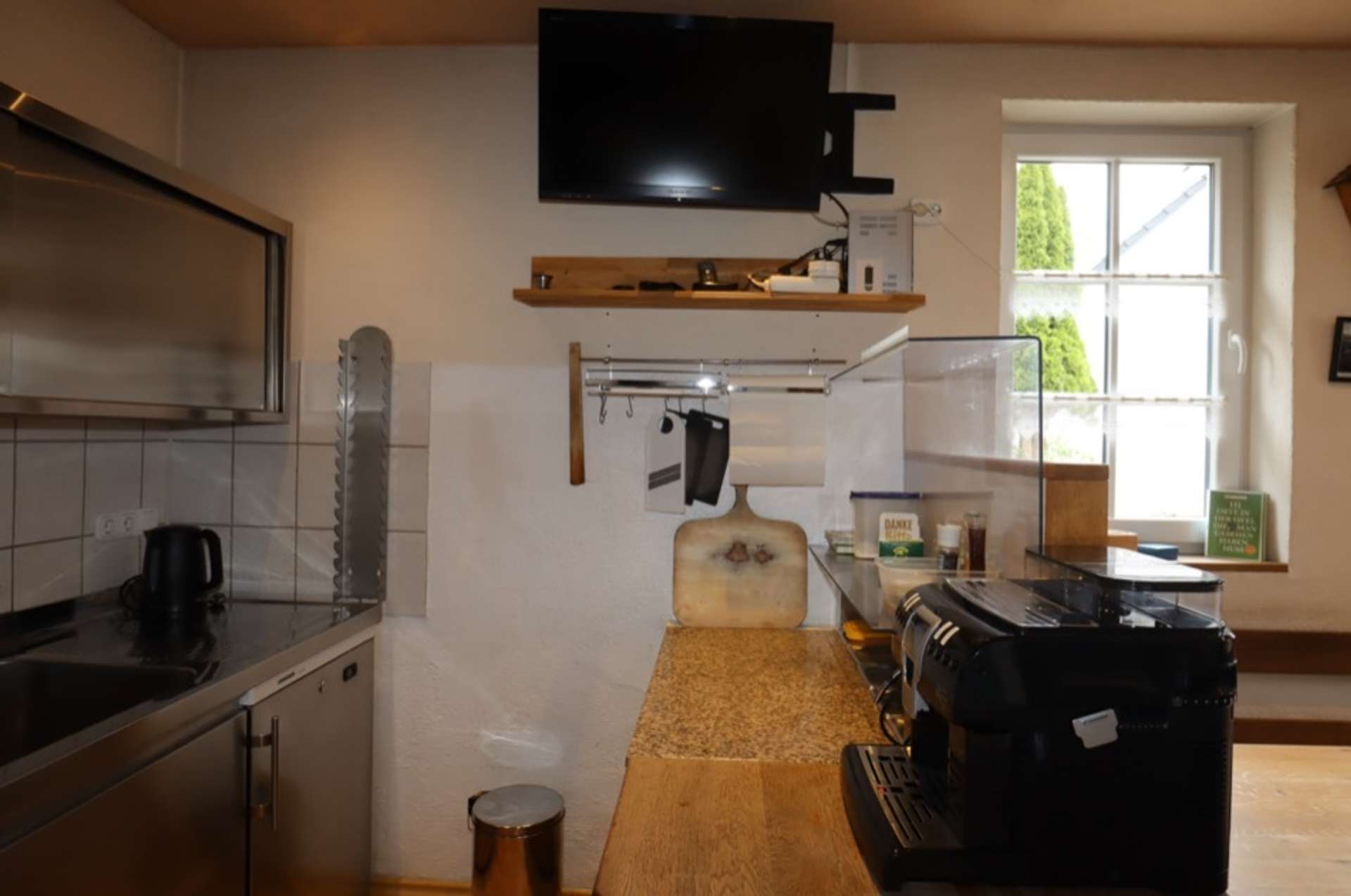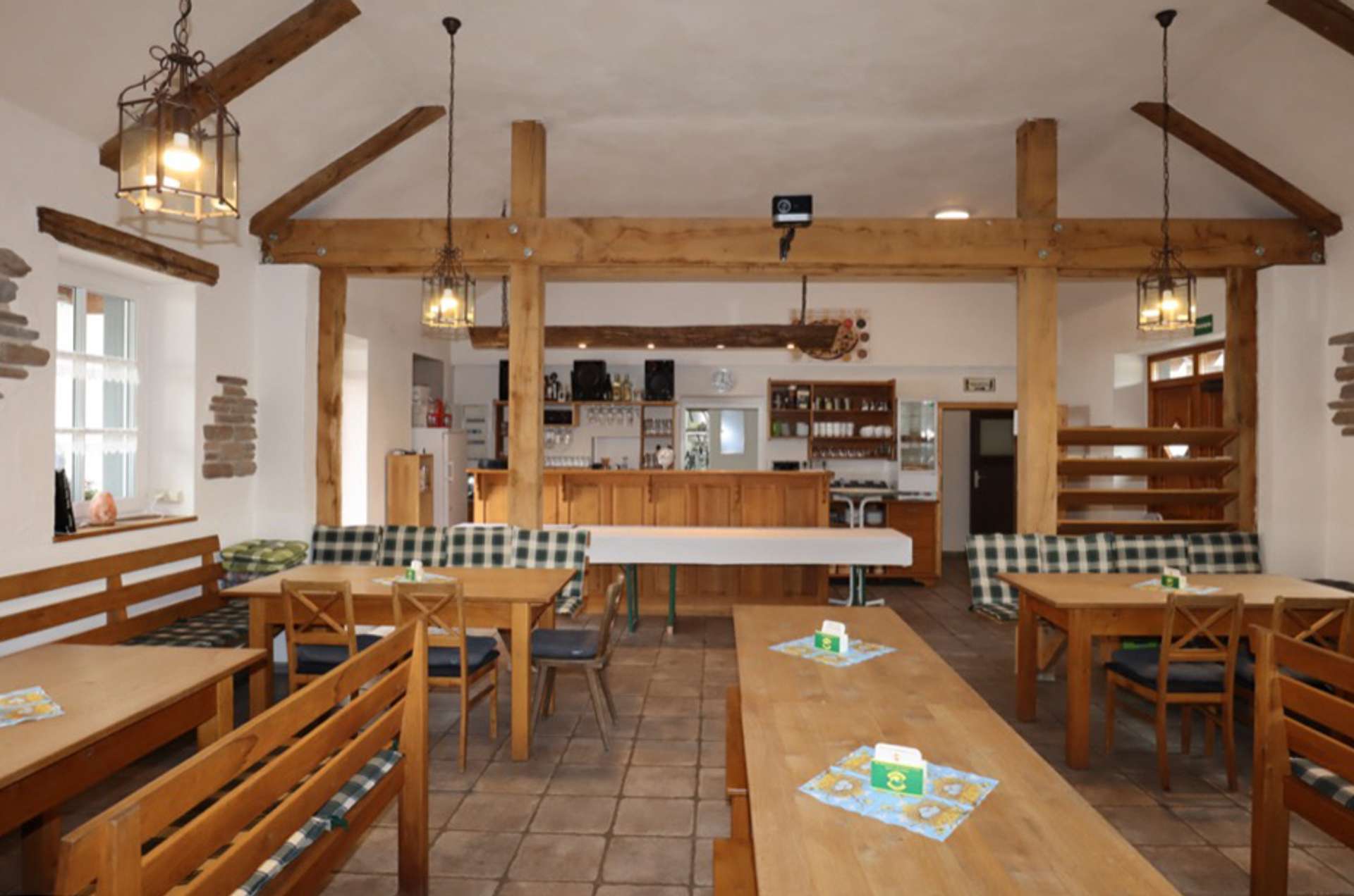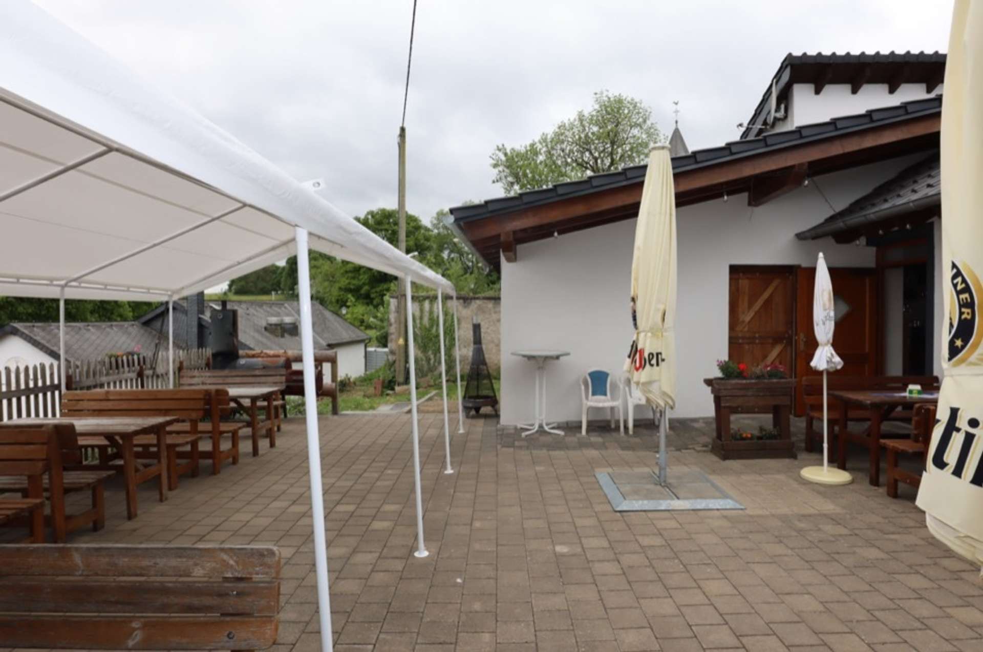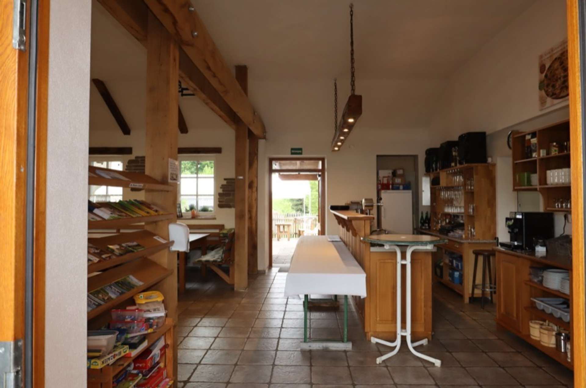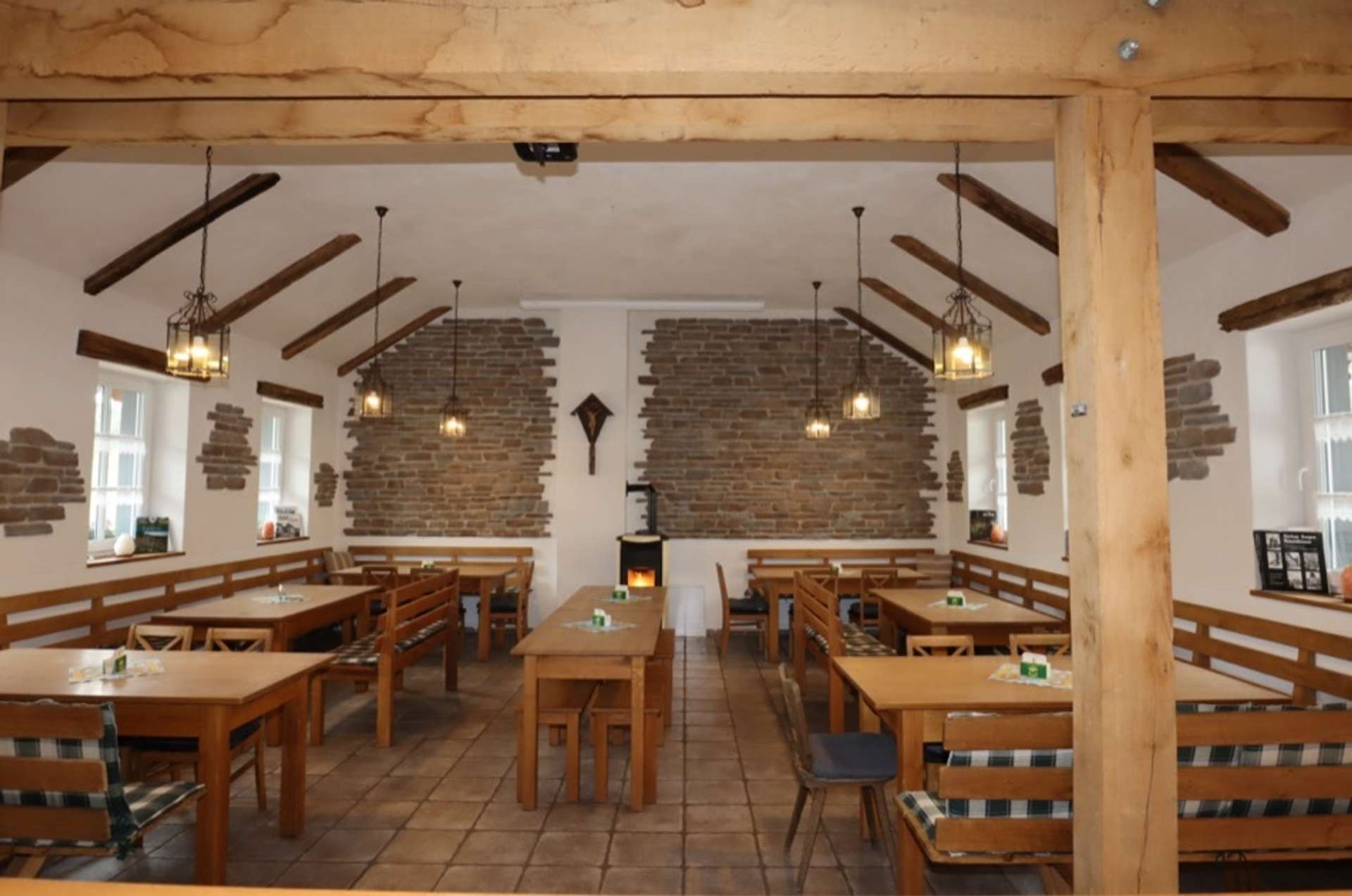 2015 erfolgte dann der Erweiterungsbau zum Hauptgebäude mit eigenem Eingang, der im Landhausstil mit sichtbaren Holzbalken, Sichtmauerwerk und Holztischen und -bänken gestaltet wurde. Dadurch entstand eine gemütliche und anheimelnde Atmosphäre, die viele Wanderer und auch Gäste aus der Region zu schätzen wissen. Vom Gastraum mit Theke und XX Sitzplätzen erreicht man den Außenbereich, der ganz im Stil des Gesamtobjekts mit Holzmobiliar ausgestattet ist und der gleichzeitig durch eine Treppe einen Zugang zu dem auf der Gebäuderückseite befindlichen Parkplätzen bietet. Hier wird gegrillt und gesellig zusammengesessen. Ein kleiner Anbau beherbergt den Backraum (Küche) und bietet noch Platz für eine Außenküche. Hier können neue Eigentümer eigene Pläne verwirklichen. Das Gebäude bietet an Räumen den Gasttraum, Küche, Kühlraum, Technikraum, WCs und einen Flur, der die Verbindung zum Imbiss bildet.