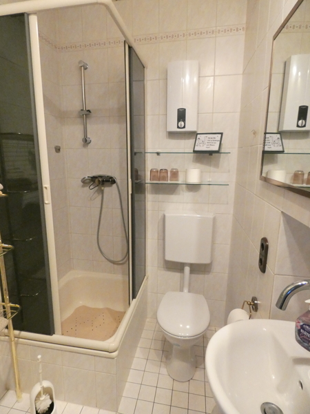 Vier Treppenstufen höher befindet sich das Badezimmer (Dusche, WC), welches über den Flur erreicht wird.