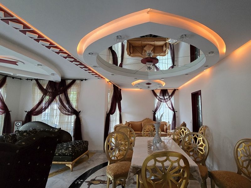 Die hochwertigen Kristalllampen der aufwändigen Deckenbeleuchtung setzen den gesamten Wohn- und Essbereich in ein wahrlich perfektes Licht.