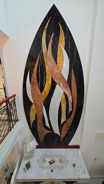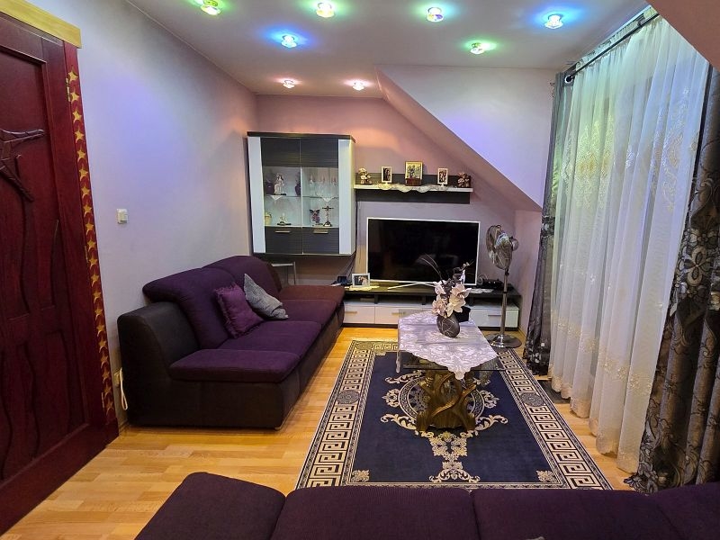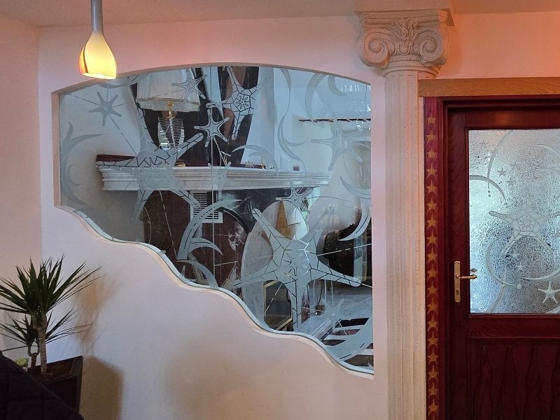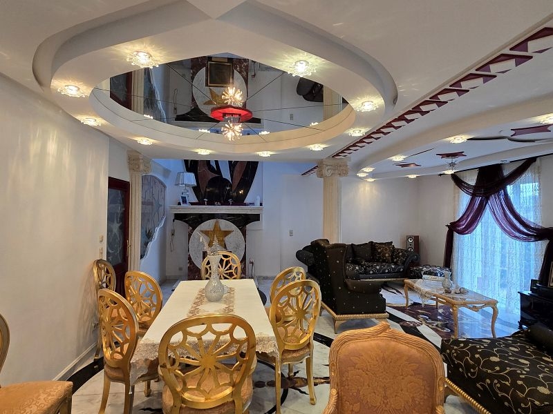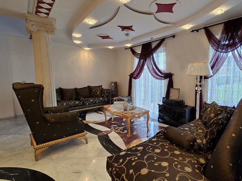Een plafondgedeelte met een kleine galerij verbindt de begane grond met de bovenverdieping. De stijlvolle open haard met marmeren bekleding, die zich over twee verdiepingen uitstrekt, lijkt op een vlammende vlam. Alle deuren, inclusief deurkozijnen en een deel van de beglazing, zijn op maat gemaakt.