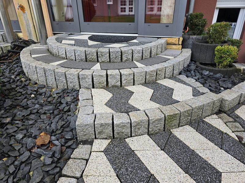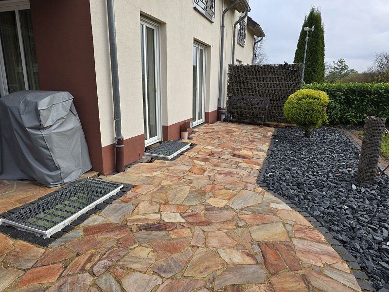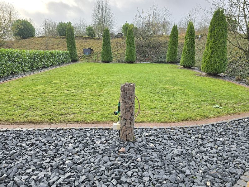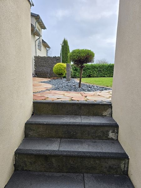 Die Außenterrasse im Bereich des Wohn- und Esszimmers ist durch den darüberliegenden Balkon teilüberdacht. Das ebenerdige Gartengrundstück ist sehr liebevoll und hübsch angelegt. Durch die Randlage genießt das Grundstück enorm viel Ruhe und Privatsphäre.