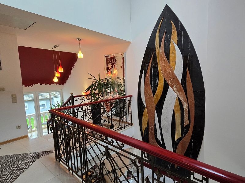 Über eine Holztreppe mit Ambientebeleuchtung im Bereich der Stufen gelangt man in das Obergeschoss. Die Galerie verleiht dem gesamten Wohnhaus ein außerordentlich modernes und offenes Erscheinungsbild. Auf halber Etage zum Obergeschoss befindet sich ein kleiner überdachter Freisitz/Balkon mit prächtigem Außengeländer.