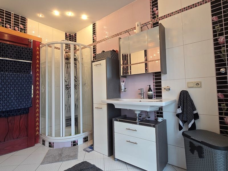 Im Obergeschoss stehen drei geräumige Schlafzimmer (ein Schlafzimmer mit Balkon) und ein Badezimmer zur Verfügung. Auch das hochwertige Bad im Obergeschoss setzt in Ausführung und Farbgestaltung hübsche Akzente.