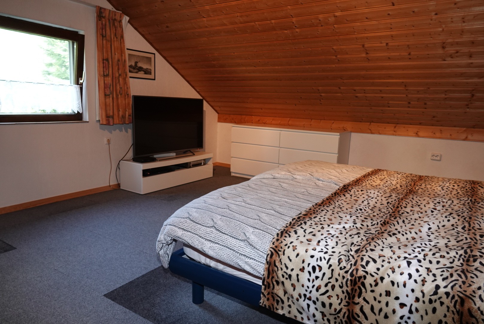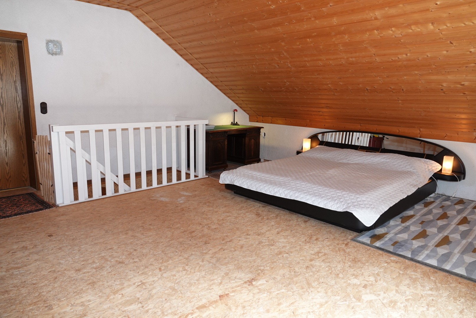 Eine breite Treppe führt zum Obergeschoss. Hier befinden sich ein sehr großes Schlafzimmer und ein weiteres Schlafzimmer. Im Obergeschoss befindet sich außerdem eine Toilette mit Waschbecken.