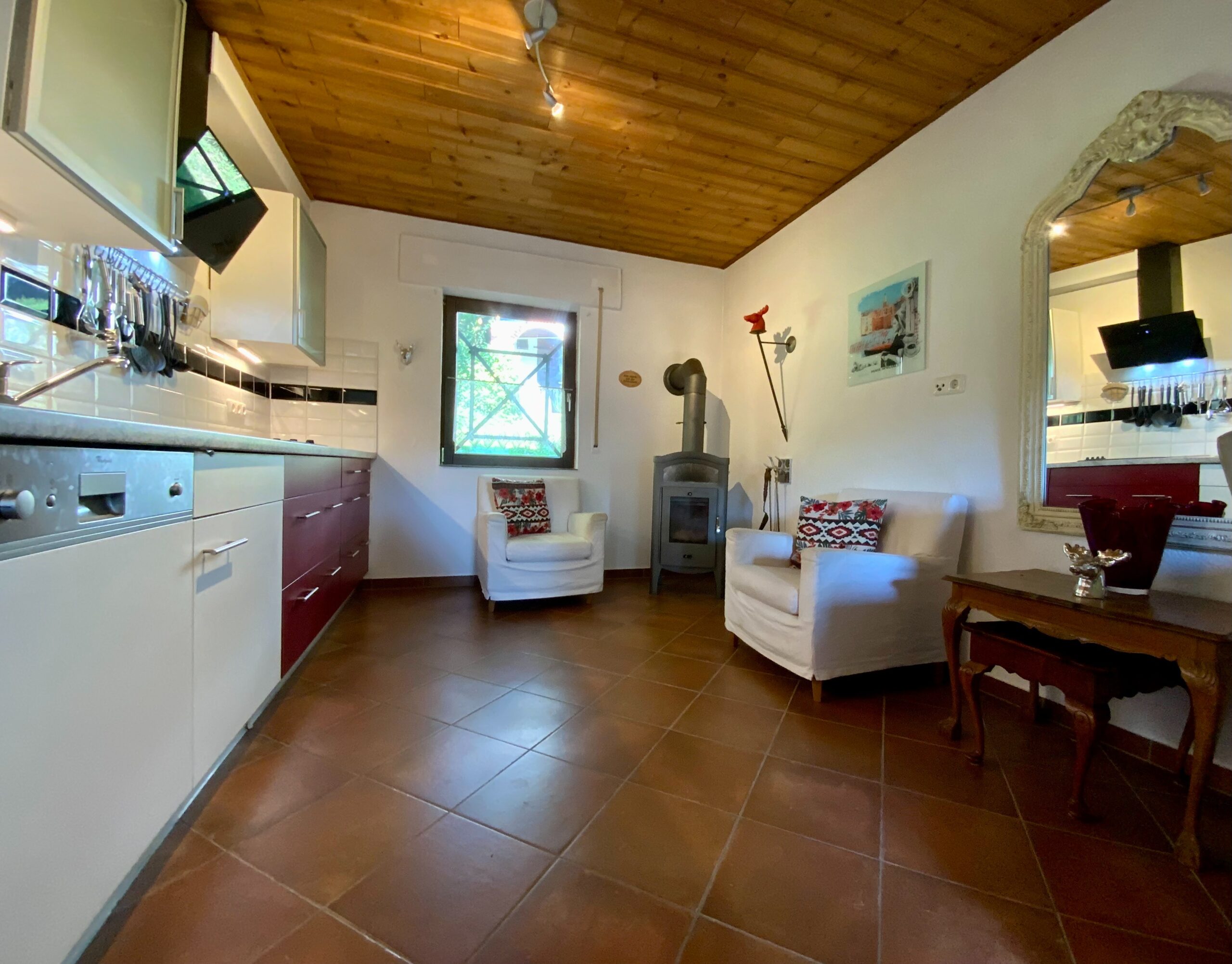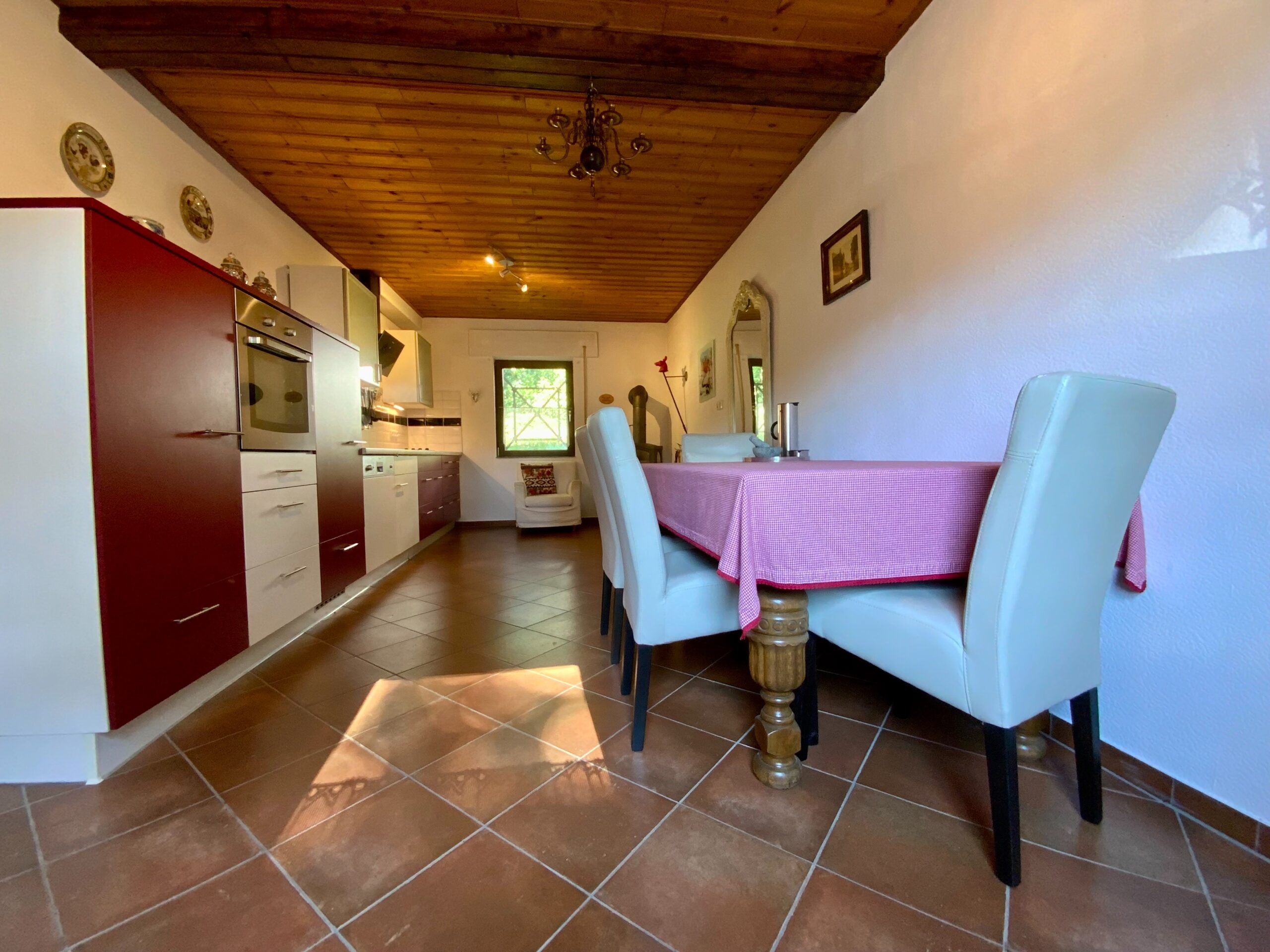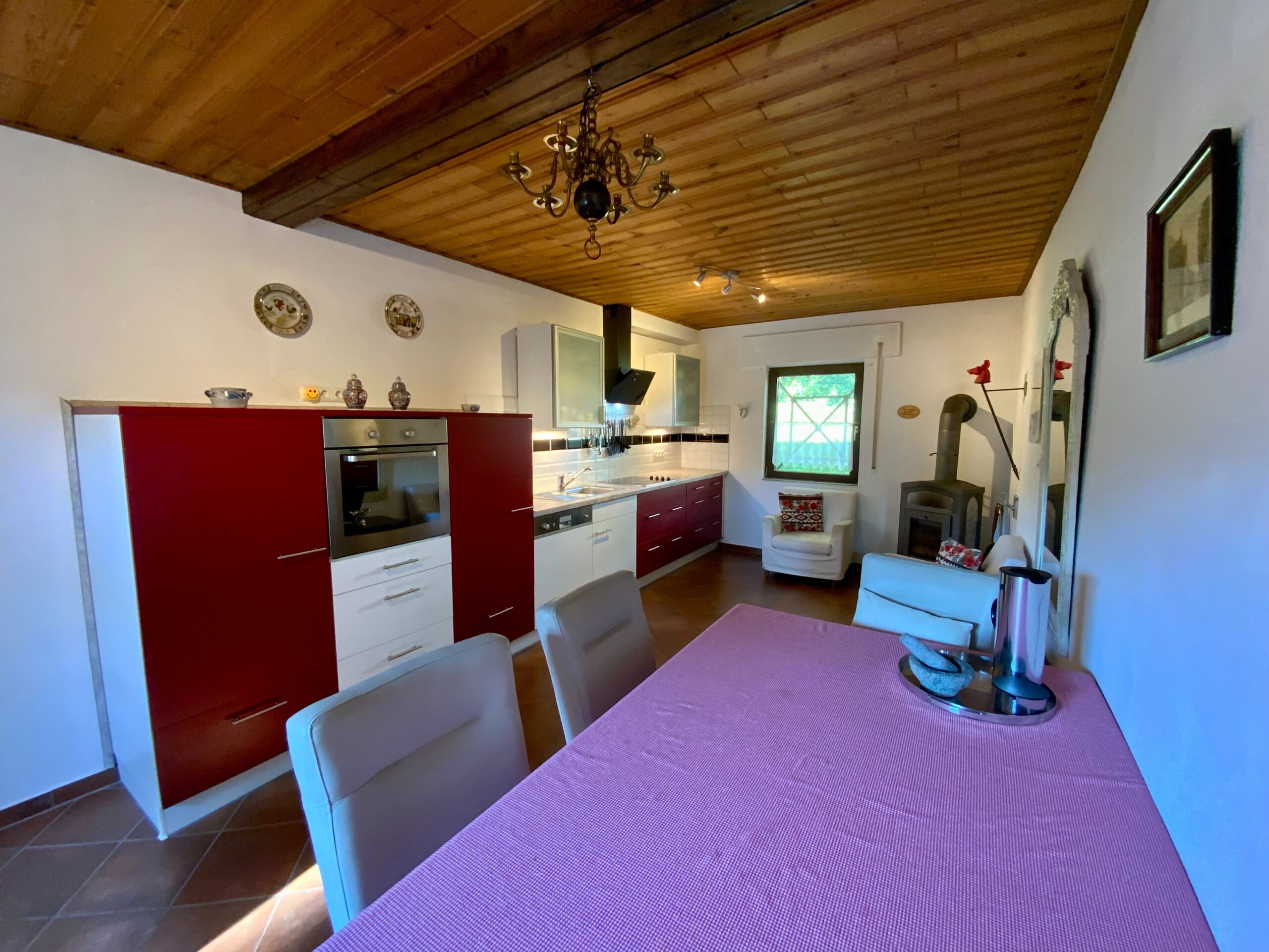 Die Küche ist ein sehr gemütlicher der momentan als Wohnküche genutzt wird. Hier befindet sich ein Holzofen Anschluss.
