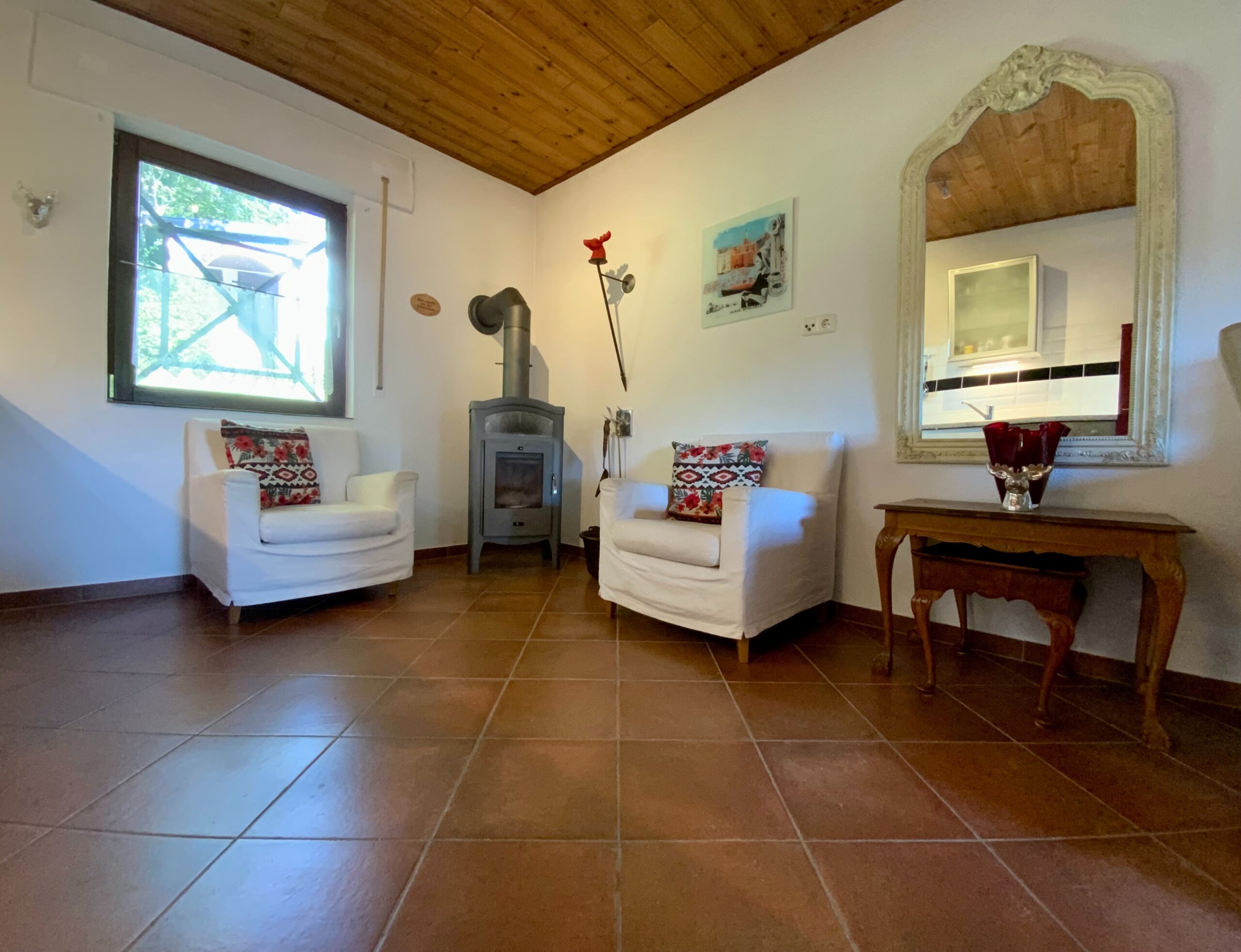 De woonkamer is voorzien van een oliekachel, die in de winter voor behaaglijke warmte en comfort zorgt. Een pellet- of houtkachel kan eenvoudig worden aangesloten.