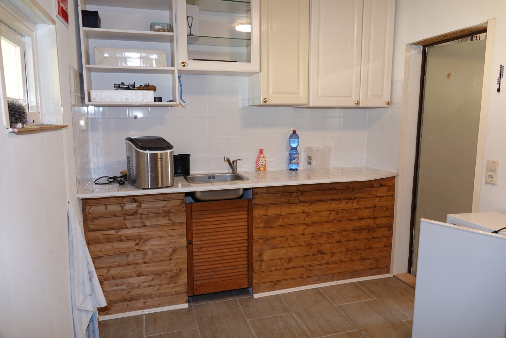 De keuken is erg gezellig en wordt momenteel gebruikt als woonkeuken. Er is een houtkachelaansluiting.