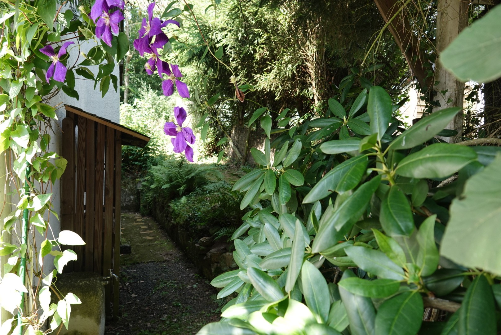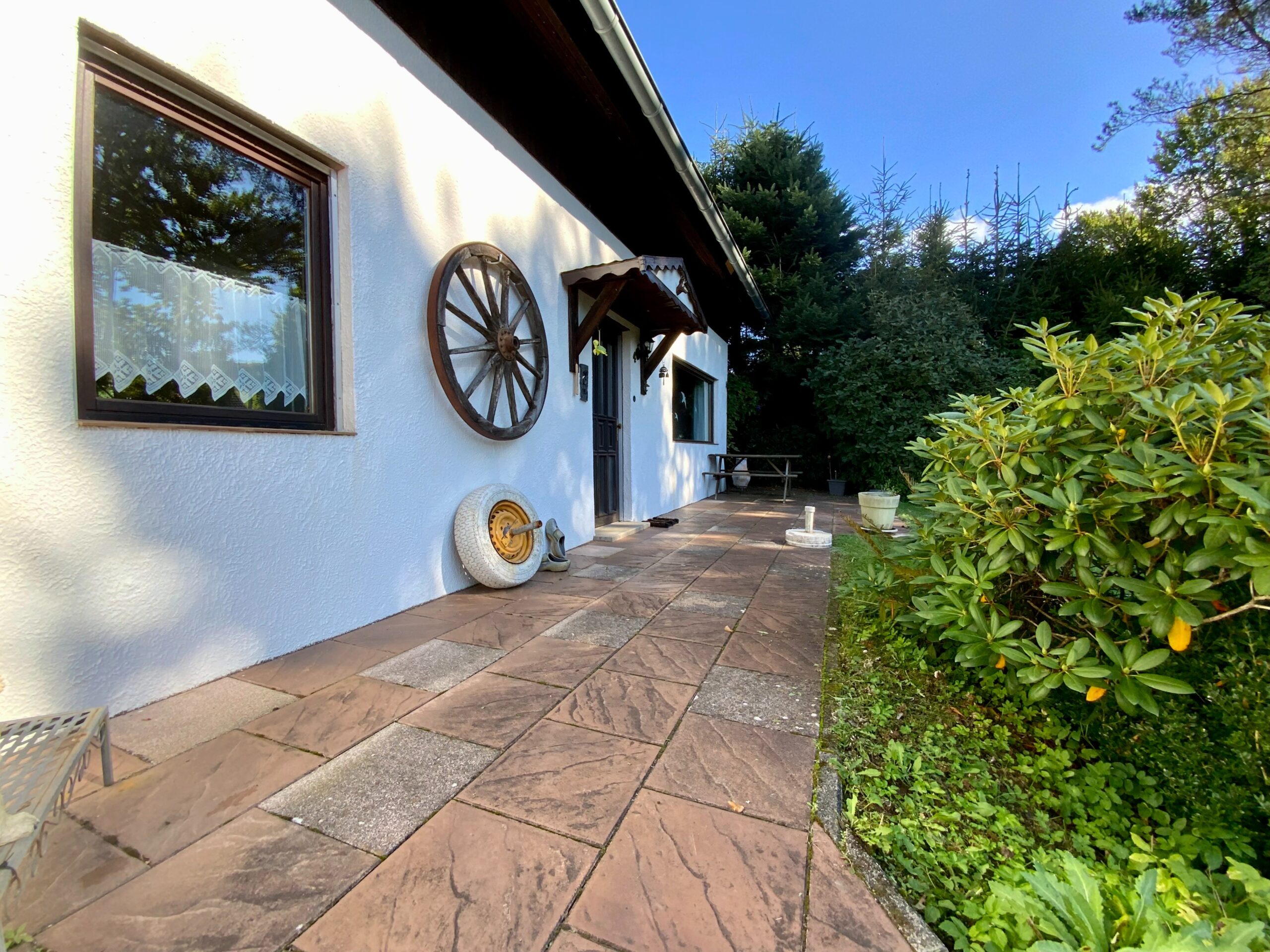 Das Haus ist über einen gepflasterten Pfad erreichbar. Die Terrasse befindet sich auf der Südseite.