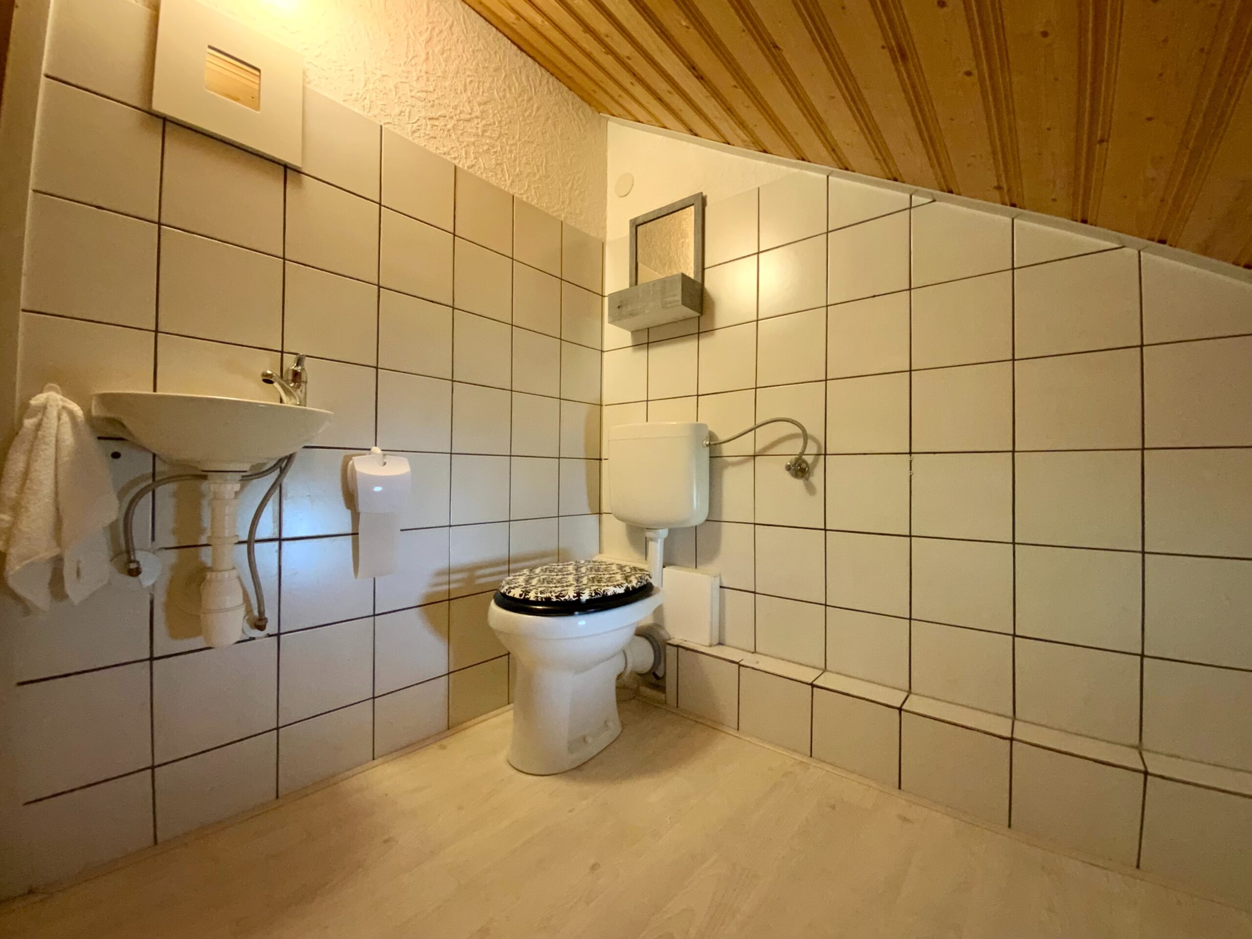 Das Badezimmer ist ausgestattet mit einer Dusche, Toilette und Waschbecken.