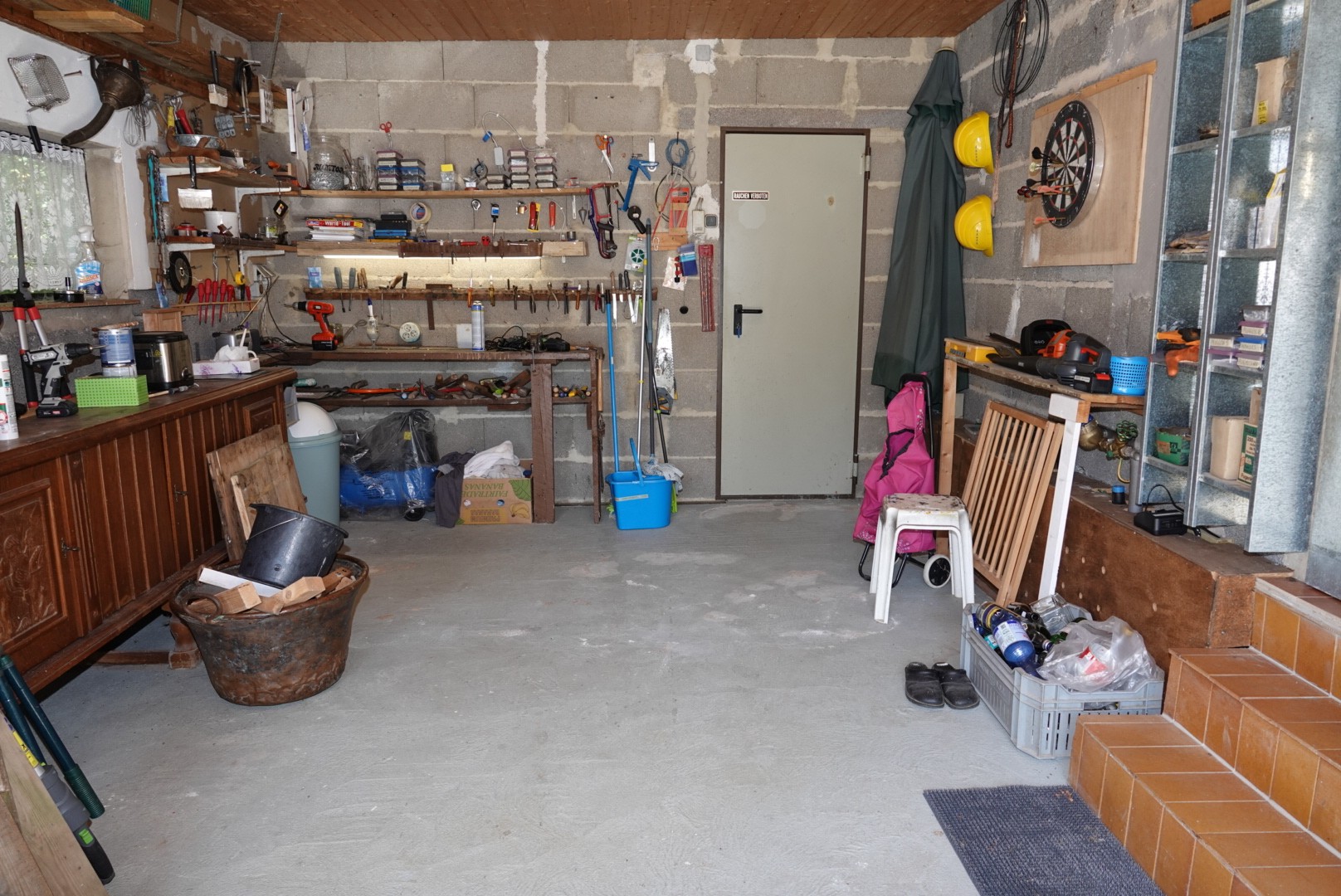 An der Rückseite des Hauses ist ein kleiner Massiver Schuppen angebaut.