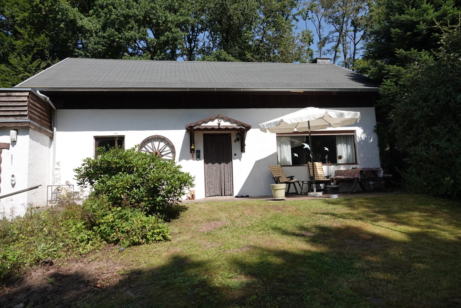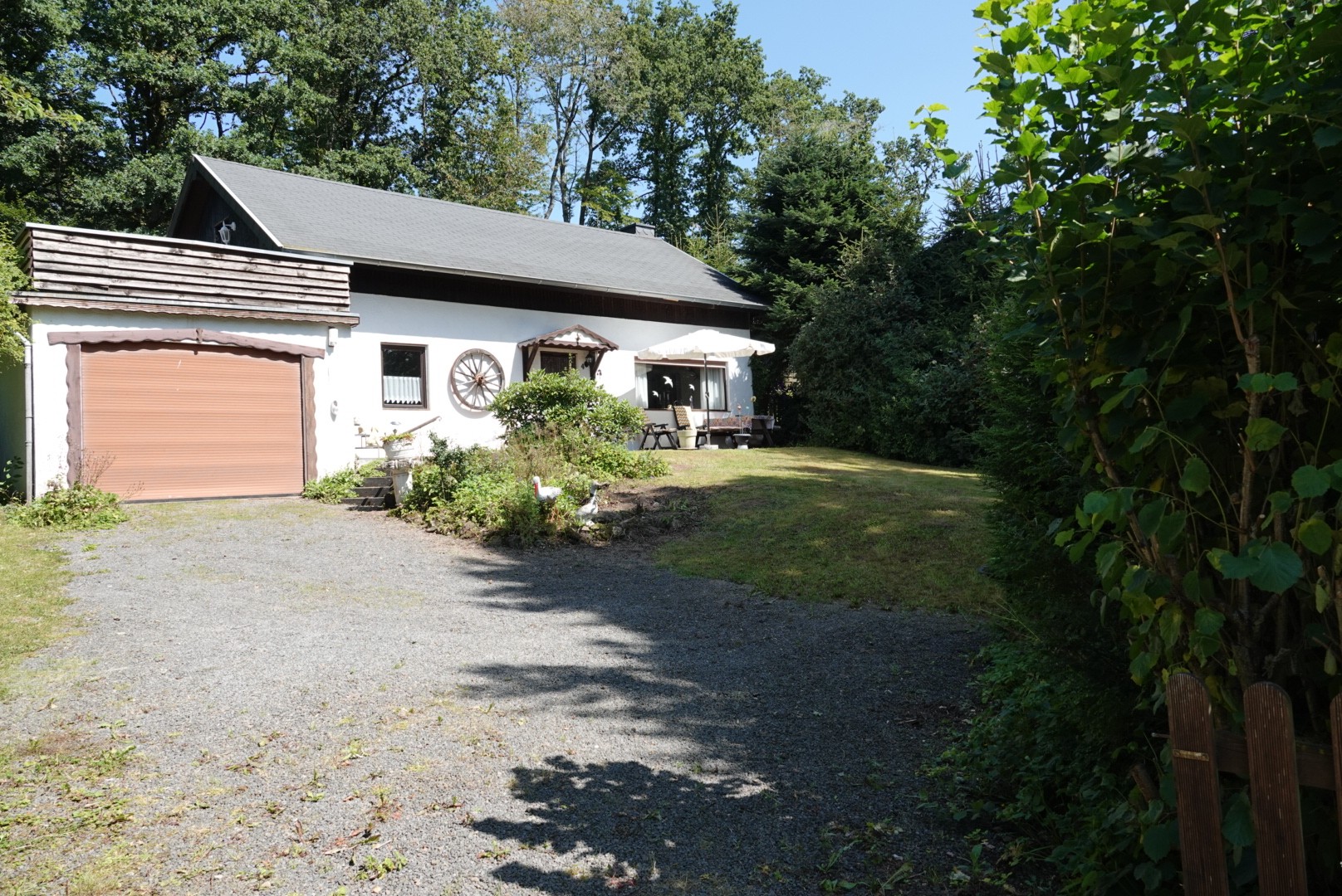 Das Haus und der Garten ist mit einer Hecke und einem Zaun umfriedet und bietet sehr viel Privatsphäre. Die Immobilie liegt in einer schönen und ruhigen Lage in einer Straße, welche in ca. 100 m Entfernung in die Natur (Wald und Feld) führt.
