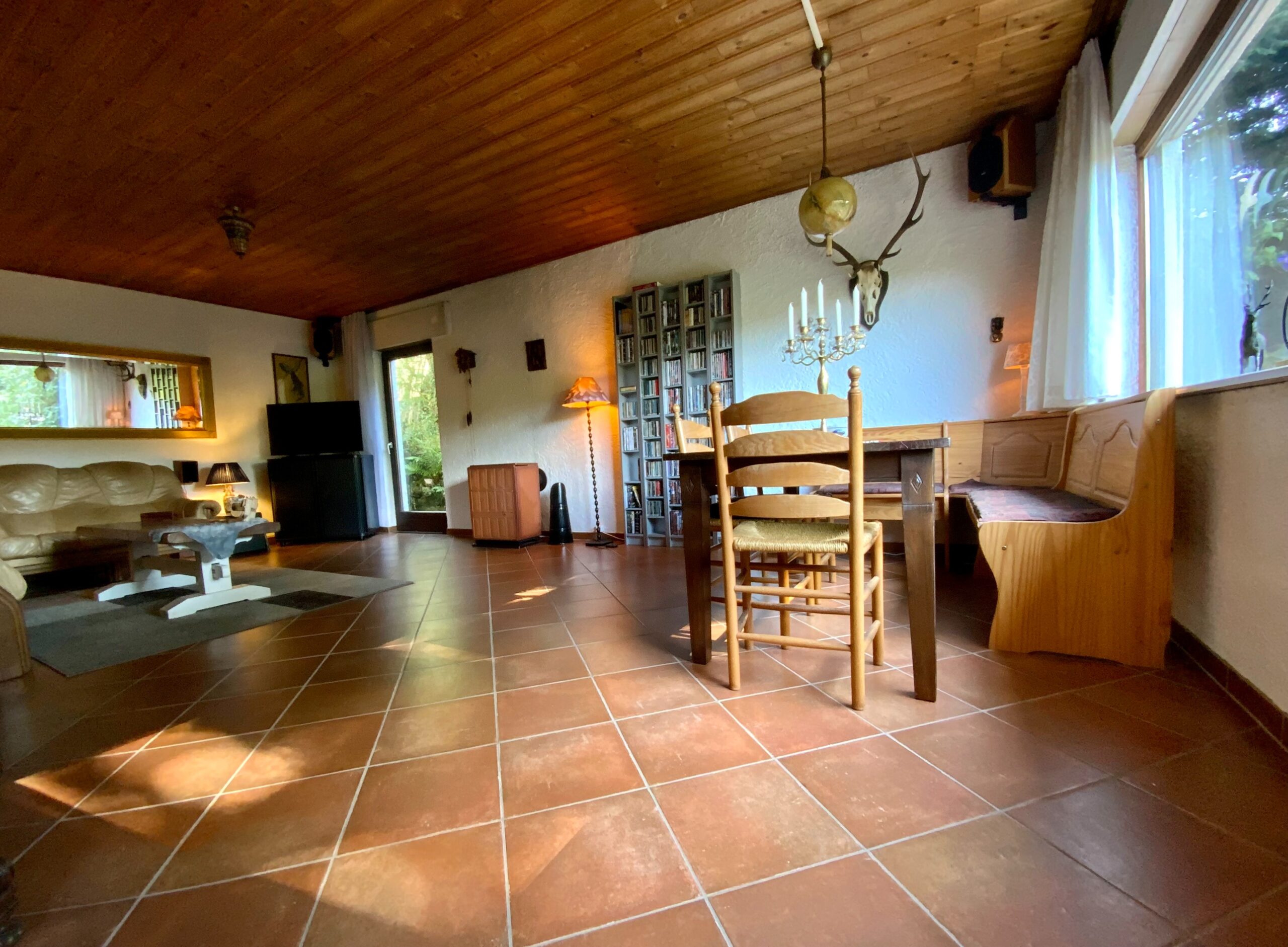 Das Wohnzimmer ist mit einem Öl-Ofen ausgestattet, der im Winter für wohlige Wärme und Behaglichkeit sorgt. Ohne Probleme könnte ein Pellet oder Holzofen angeschlossen werden.