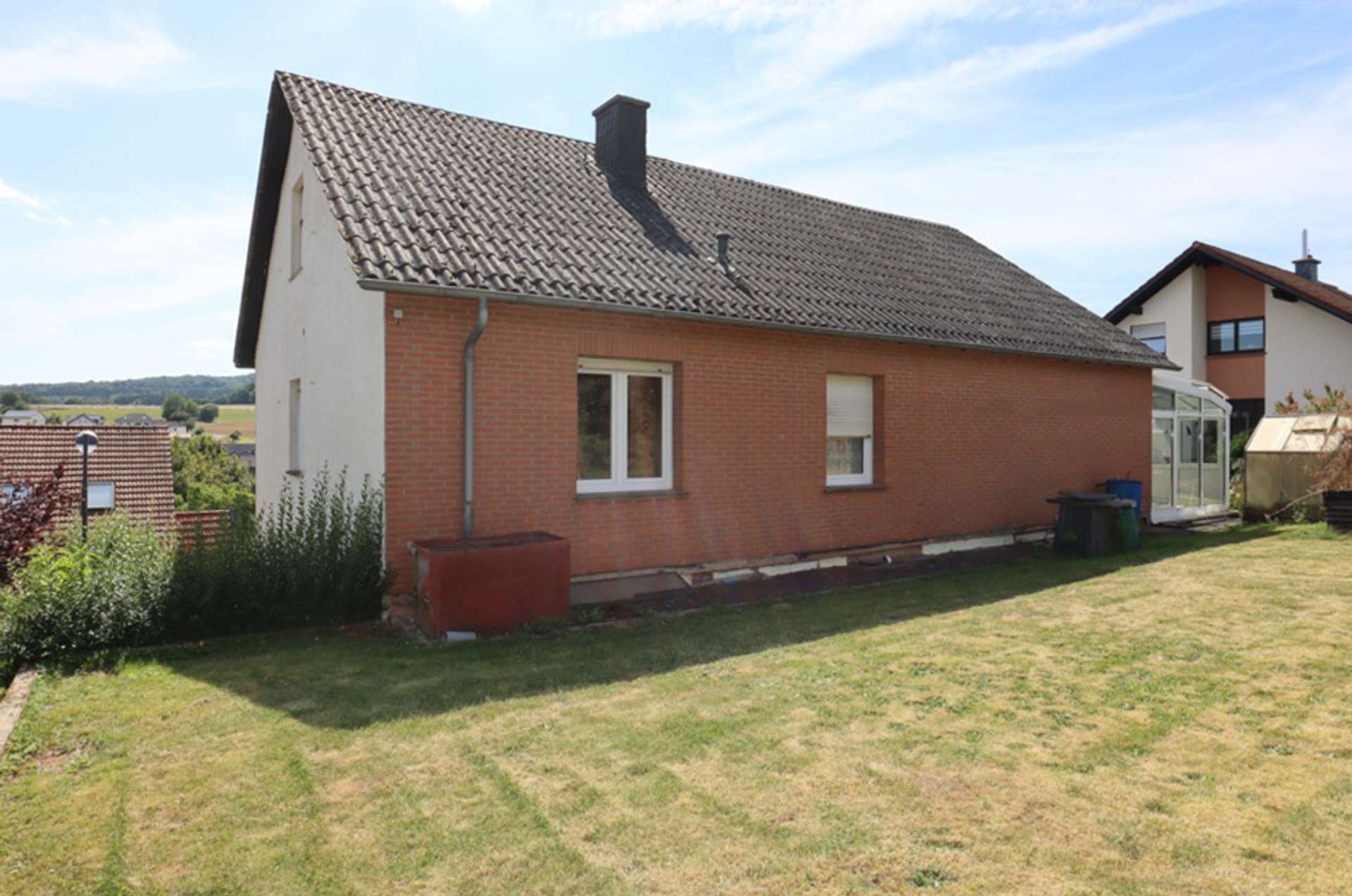 Vrijstaande woning met garage, veranda, prachtig uitzicht en tuin te koop in Oberbettingen nabij Hillesheim.