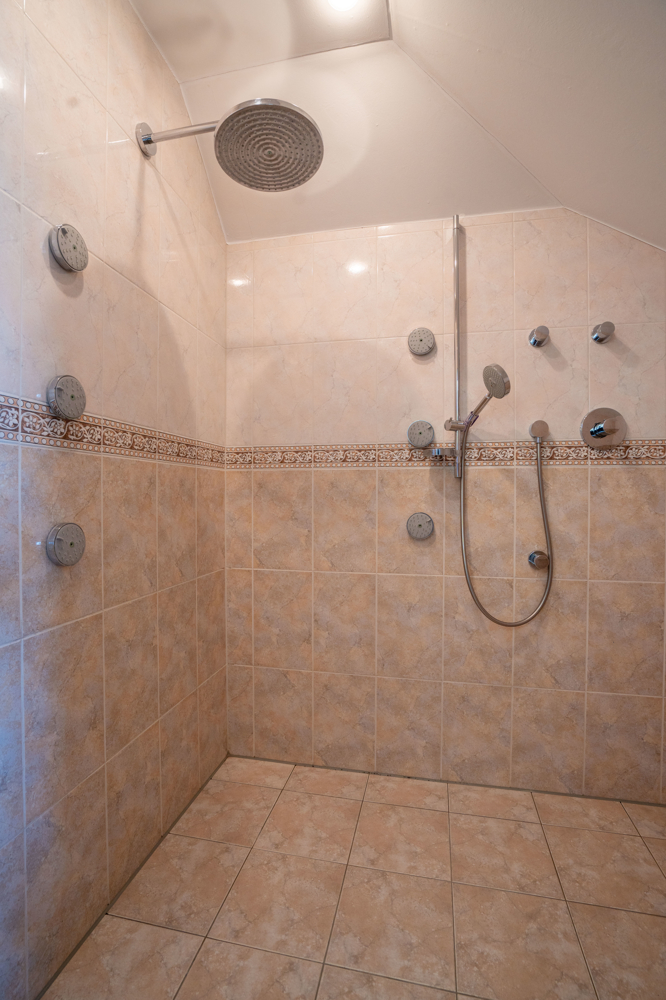 De bovenverdieping wacht op het verwelkomen van nieuwe bewoners in de ruime hoofdslaapkamer met aangrenzende en-suite badkamer met whirlpool, grote tv en eigen doucheruimte.