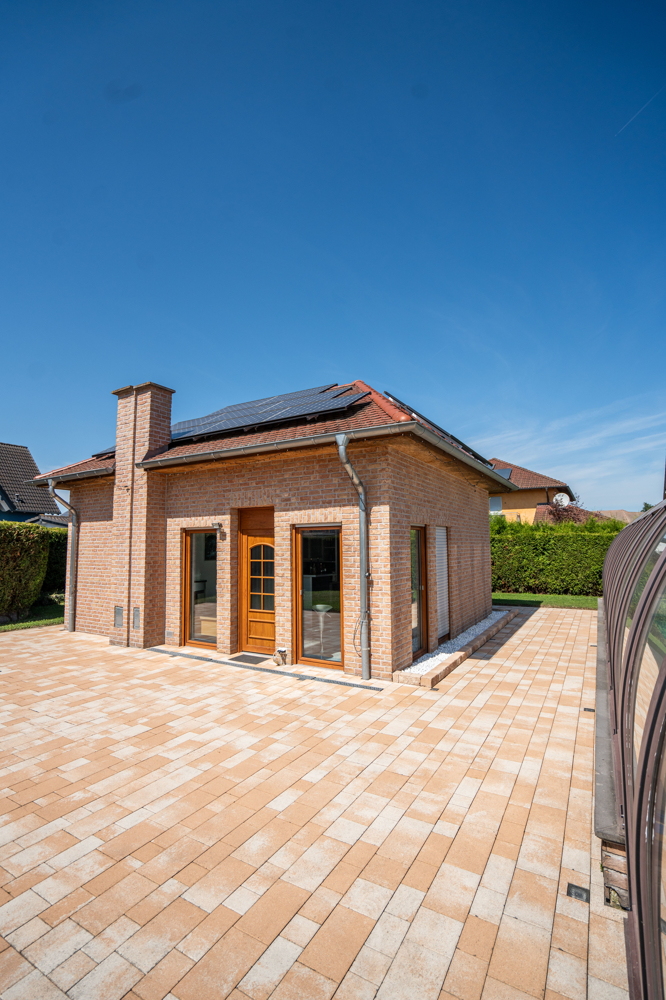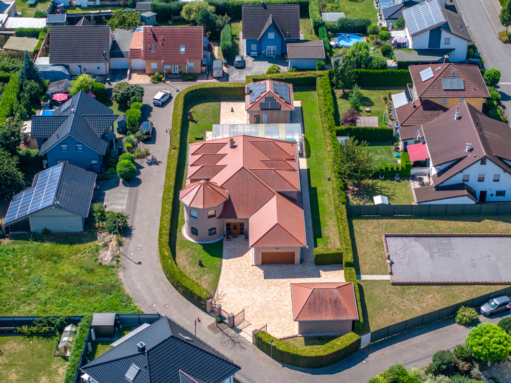 Der Gebäudekomplex besteht aus dem großzügigen Wohnhaus über zwei Etagen sowie zwei Doppelgaragen und dem massiv errichteten Poolhaus.