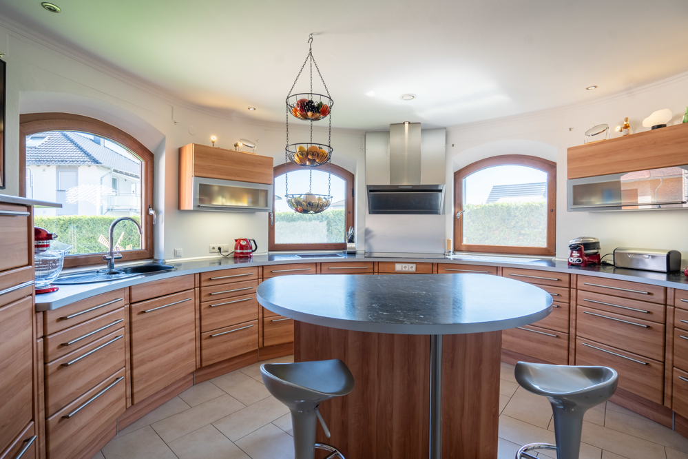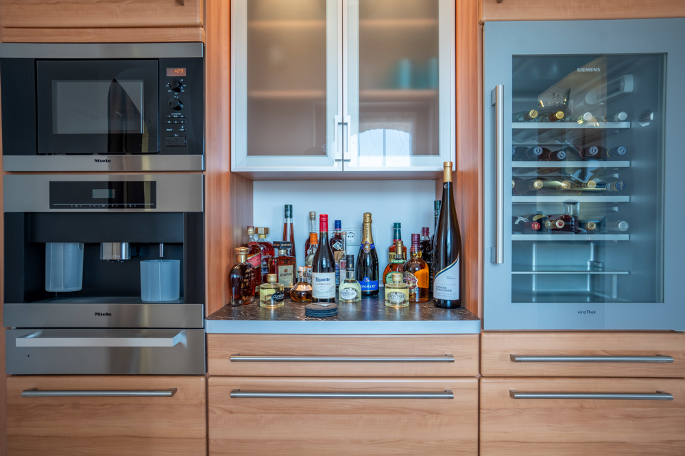 maßgefertigte, hochwertige Markeneinbauküche im Erdgeschoss des “Turmes” und genießen einen nahezu “Rundumblick”, während Sie hier Kochabende mit Ihrer Familie und Freunden verbringen. Für den Aperitif schließt sich hier im Durchgang zum Esszimmer eine kleine Getränkeküche mit Weinklimaschrank und Kaffeeautomat an.