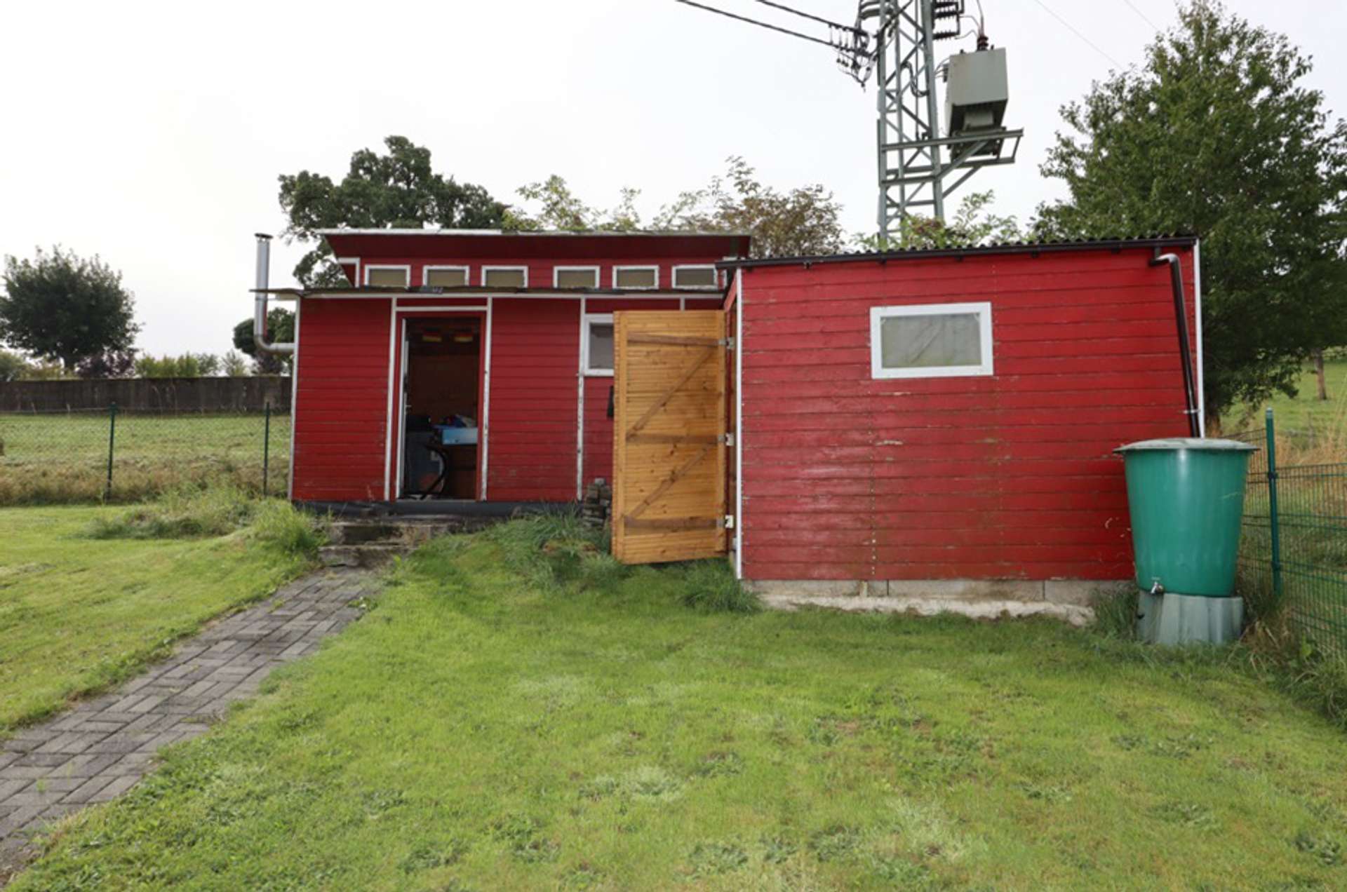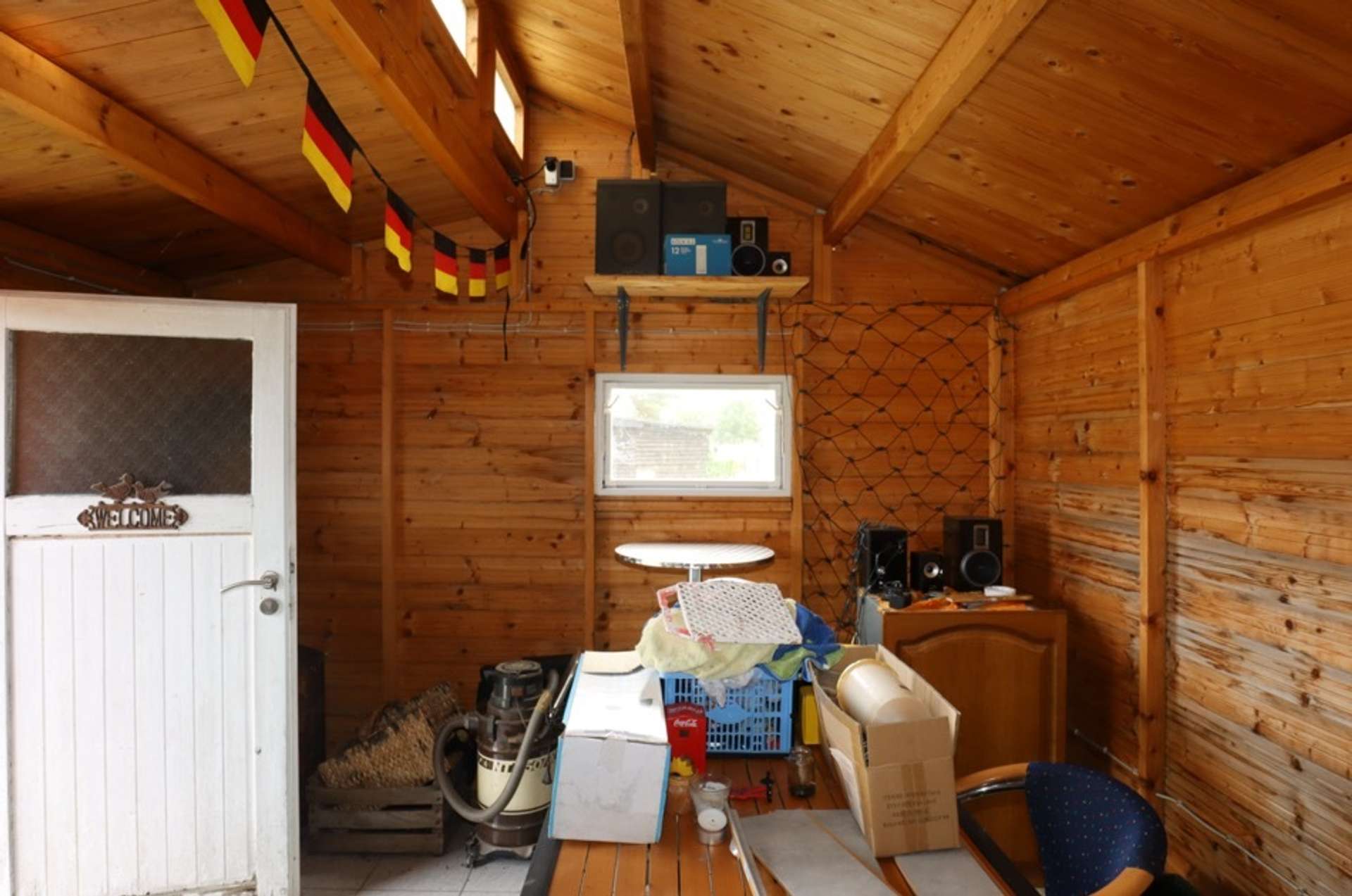 Das Grundstück hat eine Größe von 669 m2. Es ist komplett umzäunt. Die angebaute Garage bietet Platz für einen Pkw und hat einen Abstellbereich in der Verlängerung zur Hausrückseite hin, in dem sich die Heizung und Öltanks befinden. Im Garten befindet sich auch ein Holzschuppen, der aktuell als Lagerraum allerlei Nützliches genutzt wird. Das rote Holzgartenhaus bietet Platz für Geselligkeit und in einem separaten Teil ist eine kleine Werkstatt untergebracht.