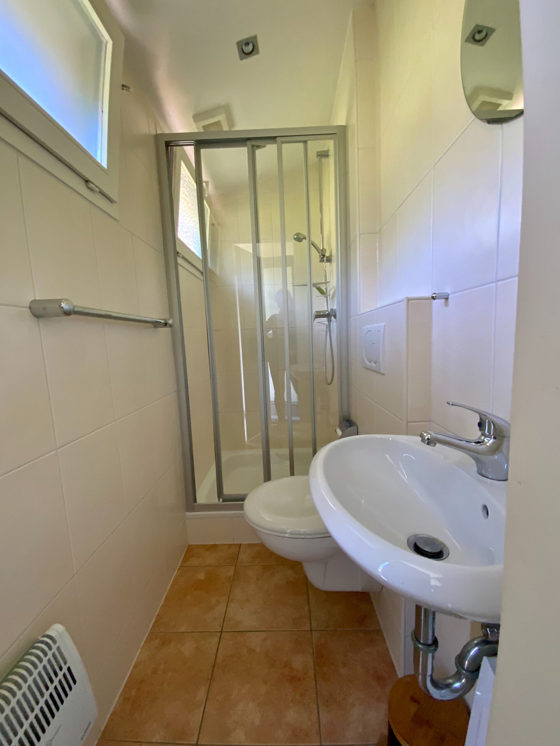 Das EG ist aufgeteilt in einen gefliesten Flur, Badezimmer (Dusche, Toilette und Waschbecken), offene Küche mit Ess- und Wohnbereich und 2 Schlafzimmern.