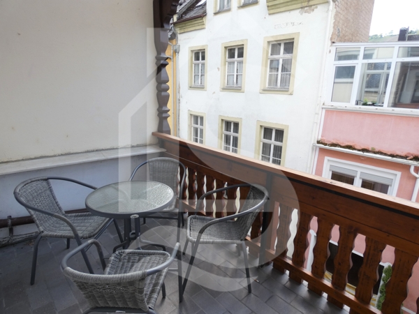 Bei der rechten Ferienwohnung (Maisonette – ca. 45 m²) liegt das Schlafzimmer, welches Zugang zur Loggia bietet, sowie das Badezimmer im Obergeschoss. Über eine innenliegende Treppe gelangt man ins Dachgeschoss und in das dort liegende Wohnzimmer mit Küche. Auf dieser Etage gibt es mit einer straßenseitigen Terrasse eine weitere Freisitzmöglichkeit. Rückseitig bietet die Maisonette-Wohnung zusätzlich einen Wintergarten.