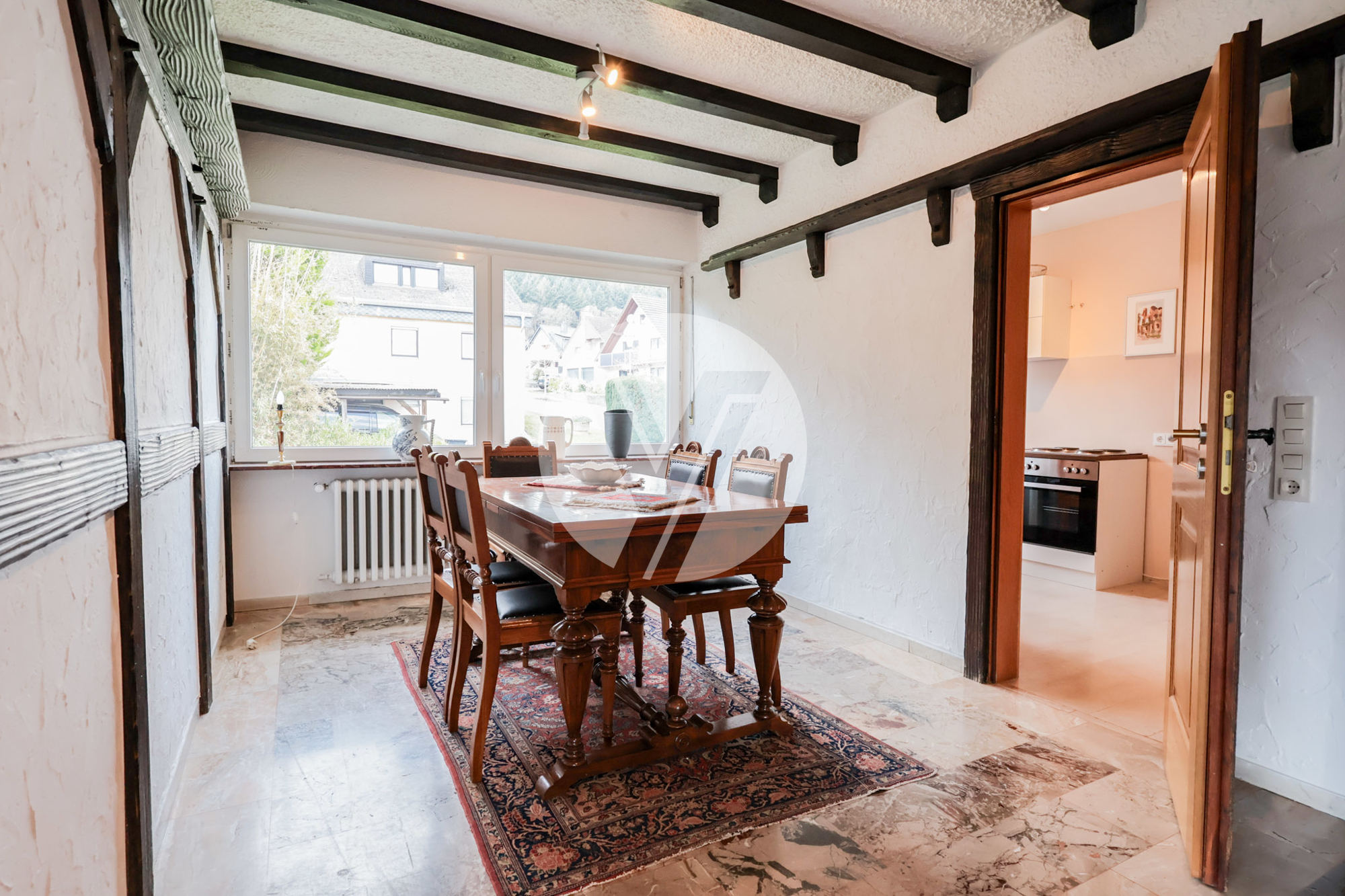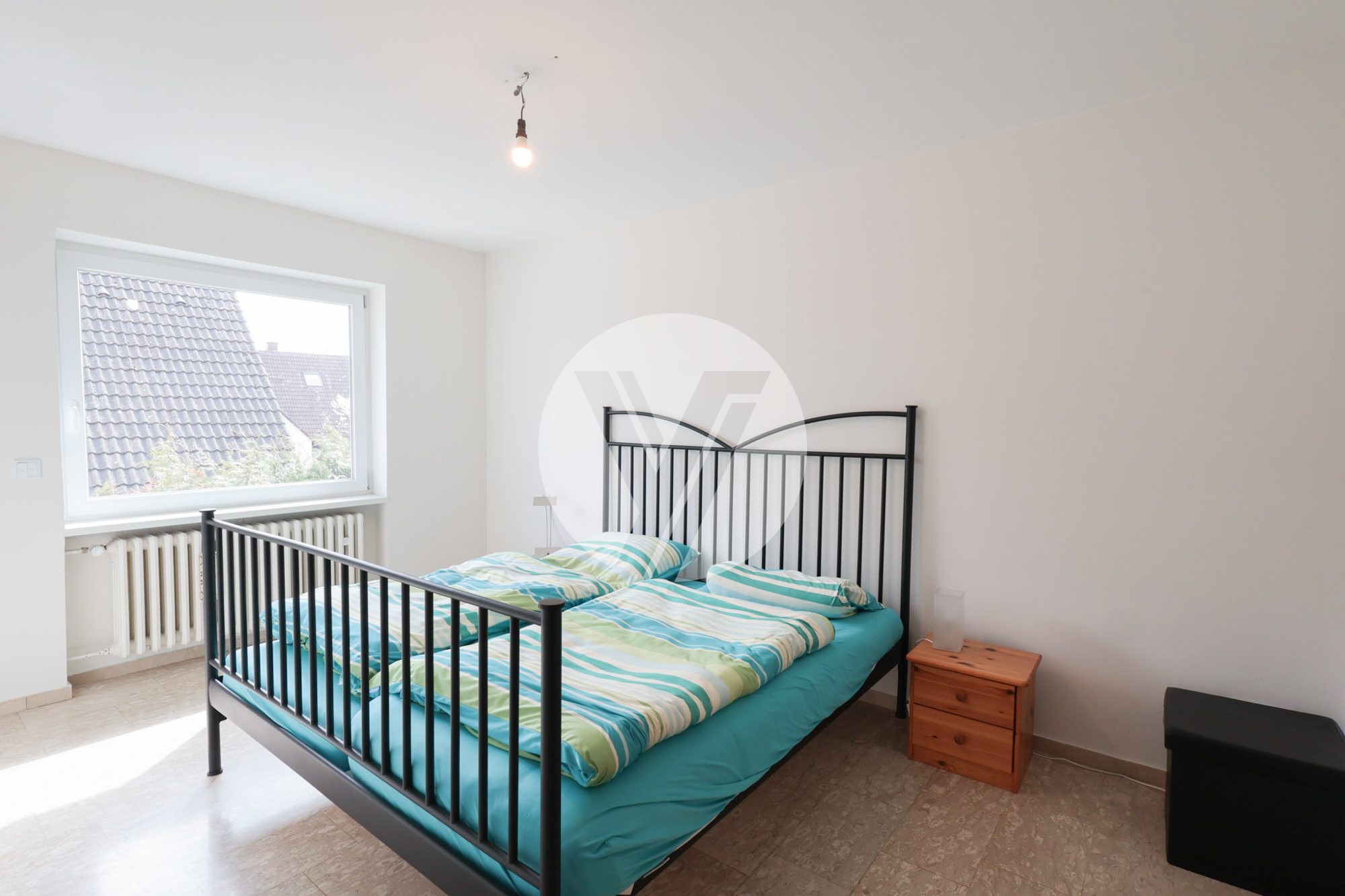 Der Bungalow profitiert von einer leichten Höhenlage, die viel Sonnenschein und einen schönen Weitblick garantiert. Ins Erdgeschoss gelangen Sie über eine ansprechende Außentreppe in die großzügige Diele, die sofort einen einladenden Eindruck hinterlässt. Hier finden sich zwei charmante Schlafräume, die durch ein angrenzendes Bad verbunden sind. Ein weiterer multifunktionaler Raum – ideal als Gästezimmer oder Homeoffice – ergänzt die Räumlichkeiten und verfügt über ein separates Gäste-WC.