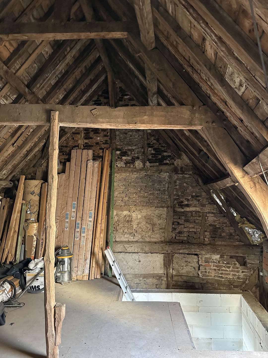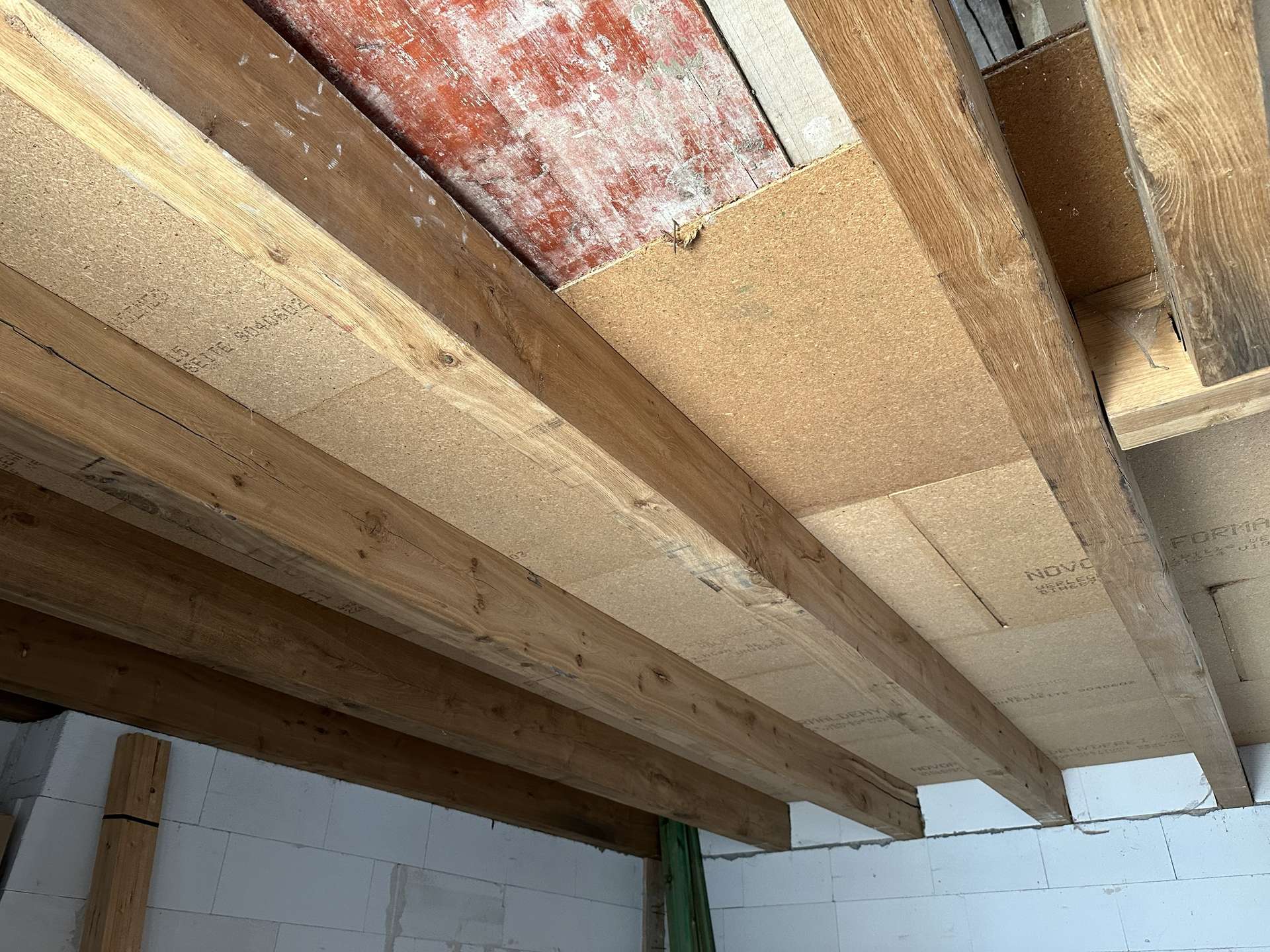 Zwischendecken aus hochwertigen, optisch ansprechenden Eichenbalken wurden ebenfalls bereits eingezogen.