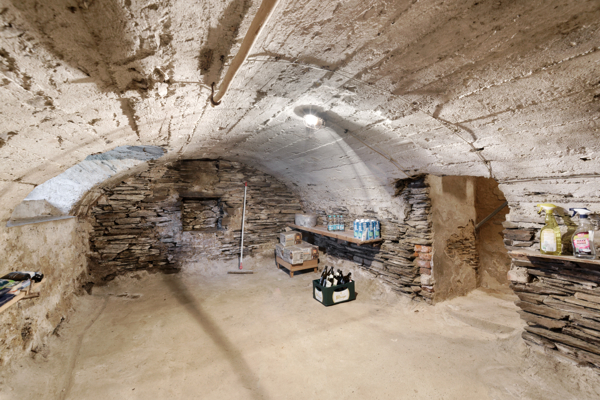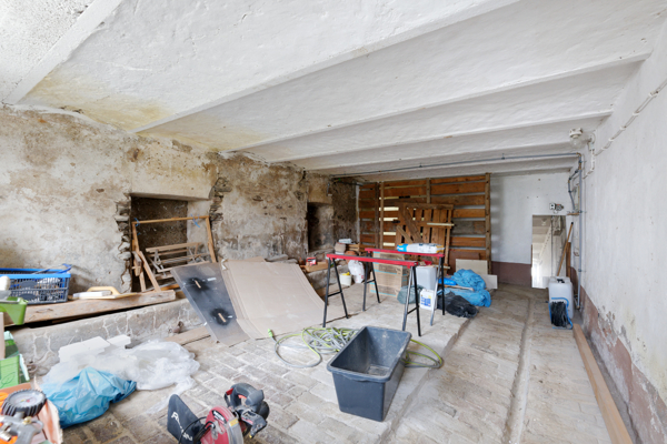 Im Erdgeschoss befindet sich das große Esszimmer mit direktem Zugang zur rückseitig gelegenen Küche. Über die Küche erreicht man zudem das Badezimmer der Immobilie. Die Küche sowie das Badezimmer befinden sich im Anbau, der vermutlich in den 50er Jahren folgte. Das Wohnzimmer ist über den Eingangsbereich zugänglich.