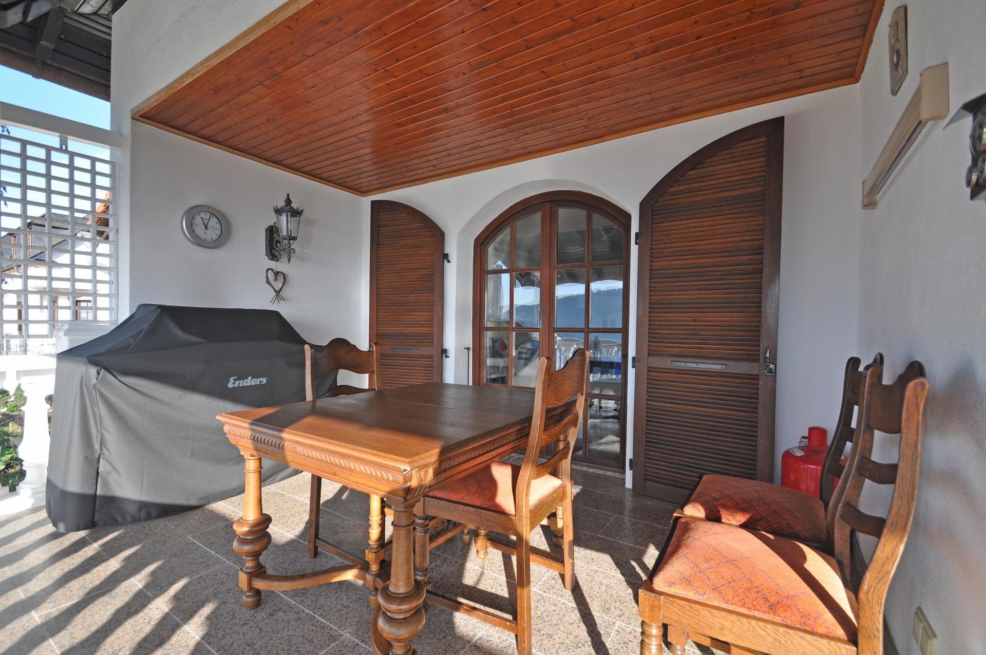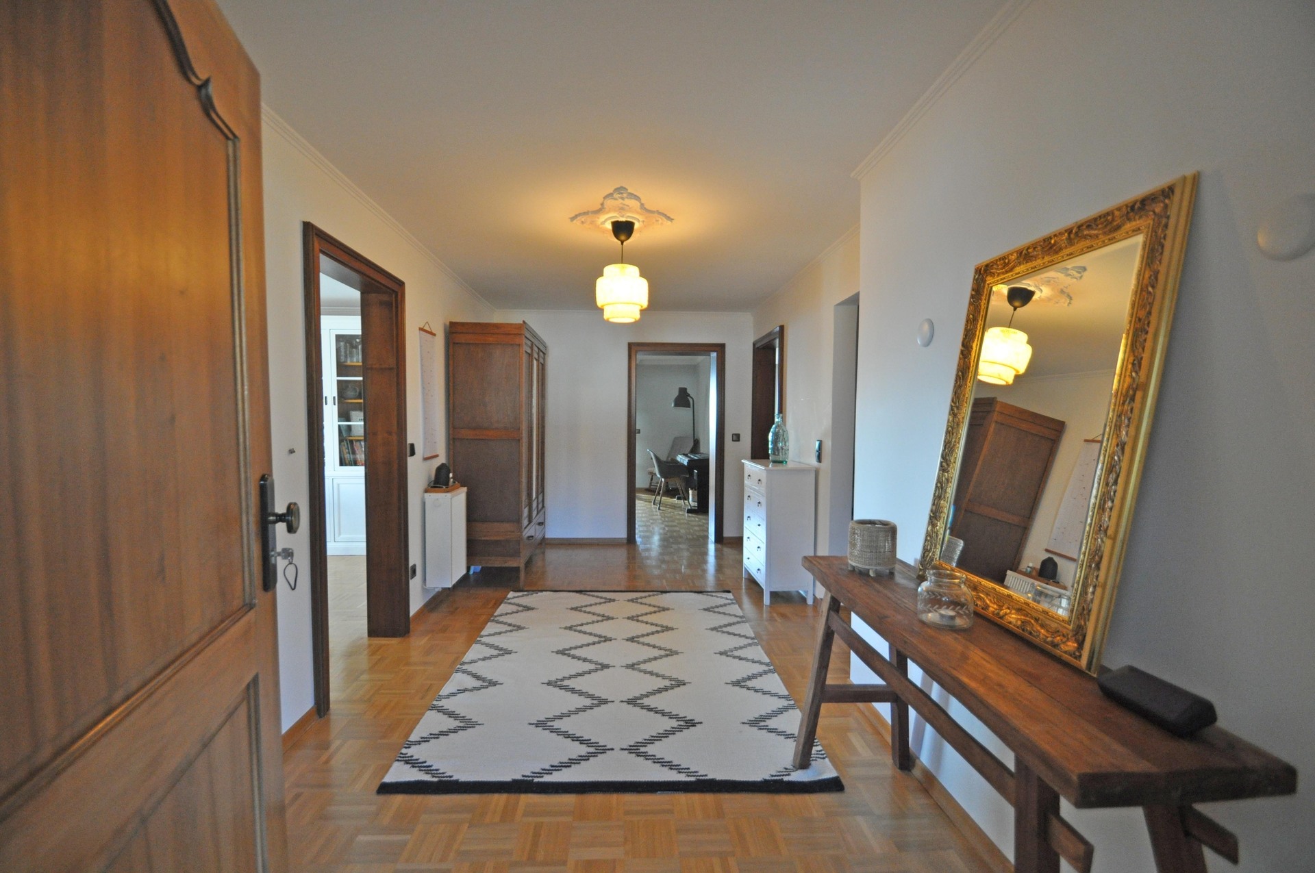In der Hauptwohnung im Erdgeschoss betreten Sie die Diele. Highlight dieser Etage ist sicherlich das große Wohnzimmer mit Holzofen und Zugang zur Terrasse mit atemberaubendem Weitblick. In das Wohnzimmer integriert ist das Arbeitszimmer. Die Küche dieser Einheit ist ebenfalls großzügig und die Einbauküche bietet viel Arbeitsfläche. Für die Vorräte ist ein Spind vorhanden. Das separaten Esszimmer mit stilvollem Dielenboden wird dank des elektrischen Kaminofens ebenfalls zu einem der begehrtesten Plätze im Haus. Das Schlafzimmer mit Bad en Suit ist der private Rückzugsort für die Eltern. Das Tageslichtbad ist komplett gefliest und bietet zum Entspannen eine Wanne. Das Schlafzimmer bietet neben dem Ankleidezimmer auch einen Zugang zu der Terrasse, welche über eine geschwungene Treppen mit Granitbelag direkt in den Garten führt. Ein Gäste WC rundet das Profil dieser eben harmonisch ab.