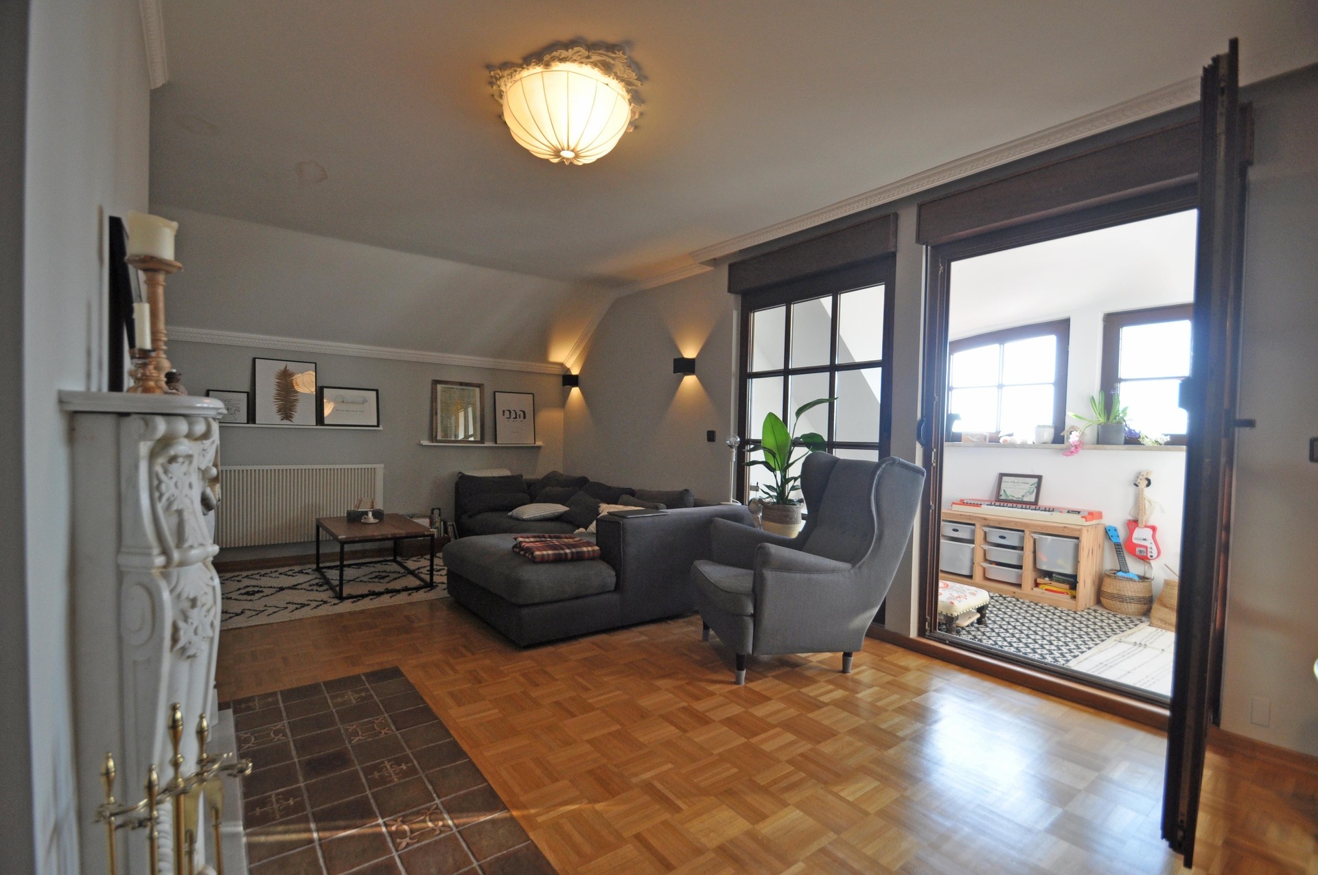 Über das Treppenhaus gelangen Sie zu der separaten Wohnung im Dachgeschoss. Hier gelangen Sie aus der Diele zunächst in die Küche mit Essbereich. Das Wohnzimmer dieser Einheit bietet ebenfalls einen Holzofen für eine warme Wohlfühlatmosphäre. Direkt neben dem Wohnzimmer liegt das erste Schlafzimmer. Aus diesem Schlafzimmer und dem Wohnzimmer gelangen Sie auf eine geschlossene Loggia, die den Wohnraum erweitert und zum verweilen einlädt. Alternativ hier kann ein Spielbereich für die kleinsten angelegt werden. Die Dachgeschosswohnung bietet ein kleines Kinderzimmer und ist somit auch für eine kleine Familie geeignet. Das Tageslichtbad mit Wanne und Dusche ist groß und verfügt neben dem WC zusätzlich über ein Bidet.