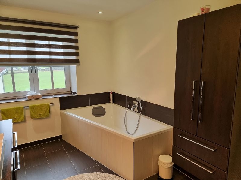 Als weiteres High-Light wurde im Bereich des Gartens eine sehr schöne und große Außenterrasse mit Holzboden angelegt. Die Terrasse verfügt über chic in den Bodenbelag eingelassene Einbauspots und Steckdosen zum Anschließen von weiteren Lampen, Elektrogrills und vielem mehr. Genießen Sie hier in den schönsten Monaten des Jahres die Ruhe der weitestgehend unberührten Natur der Eifel. Hier sagen sich im positiven Sinne gesprochen noch Fuchs und Hase gute Nacht. Eifelleben pur!