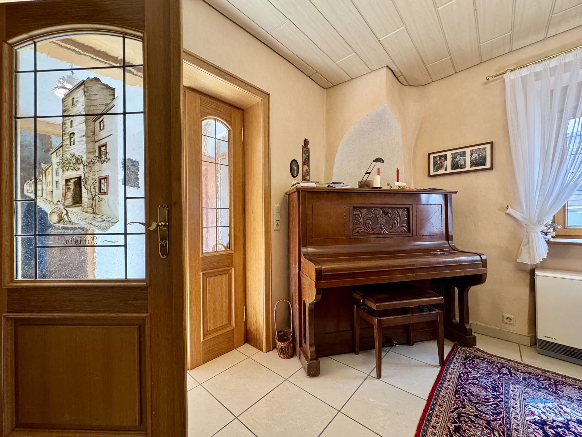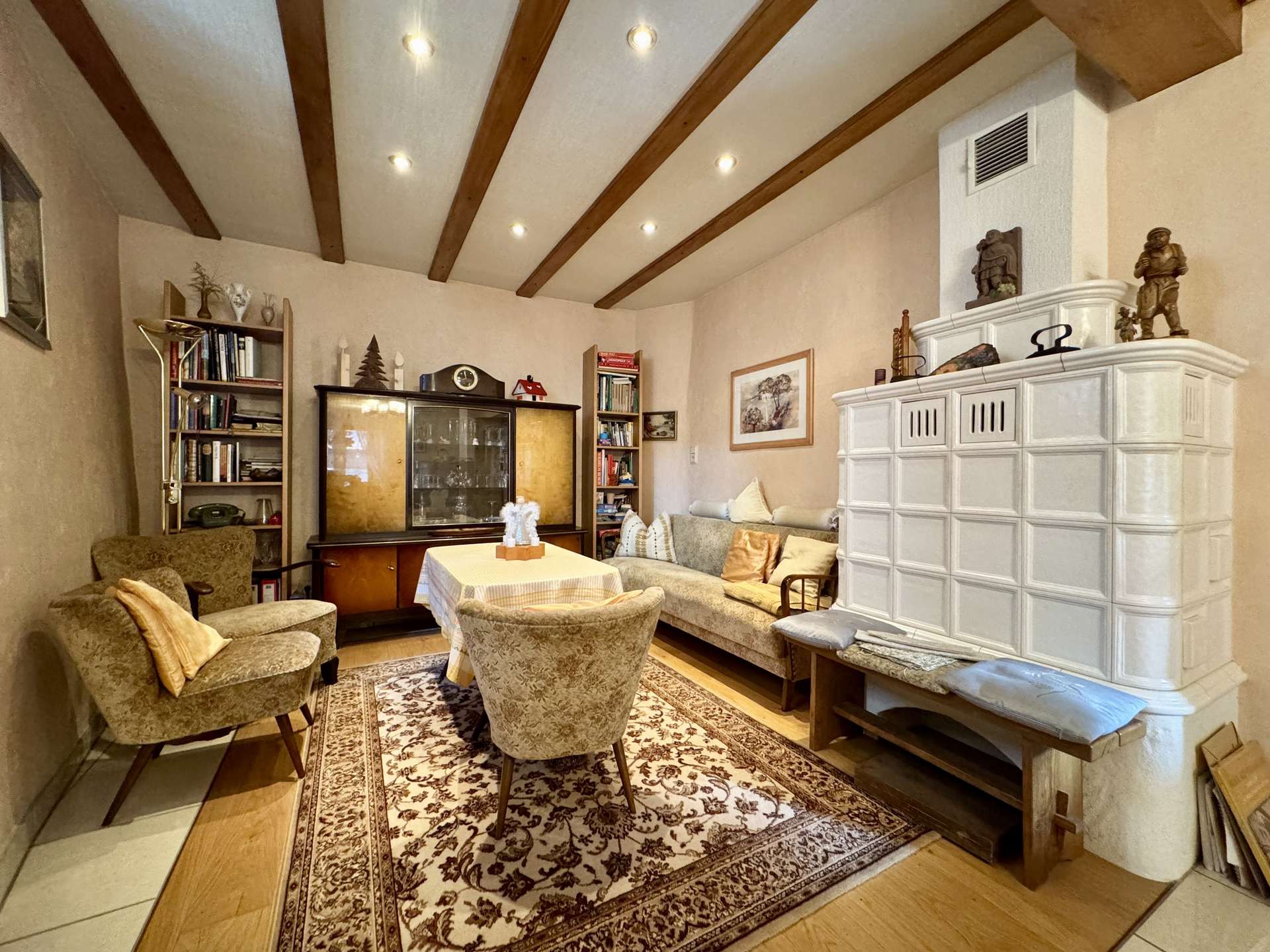 Das denkmalgeschützte Einfamilienhaus, von der Straße aus bequem erreichbar, heißt Sie über wenige Stufen im einladenden Eingangsbereich willkommen. Zu Ihrer Linken öffnet eine große Glastür den Weg in den behaglichen Wohn- und Essbereich, dessen besonderes Highlight der stilvolle Kachelofen ist – perfekt für gemütliche Stunden mit Ihren Liebsten.