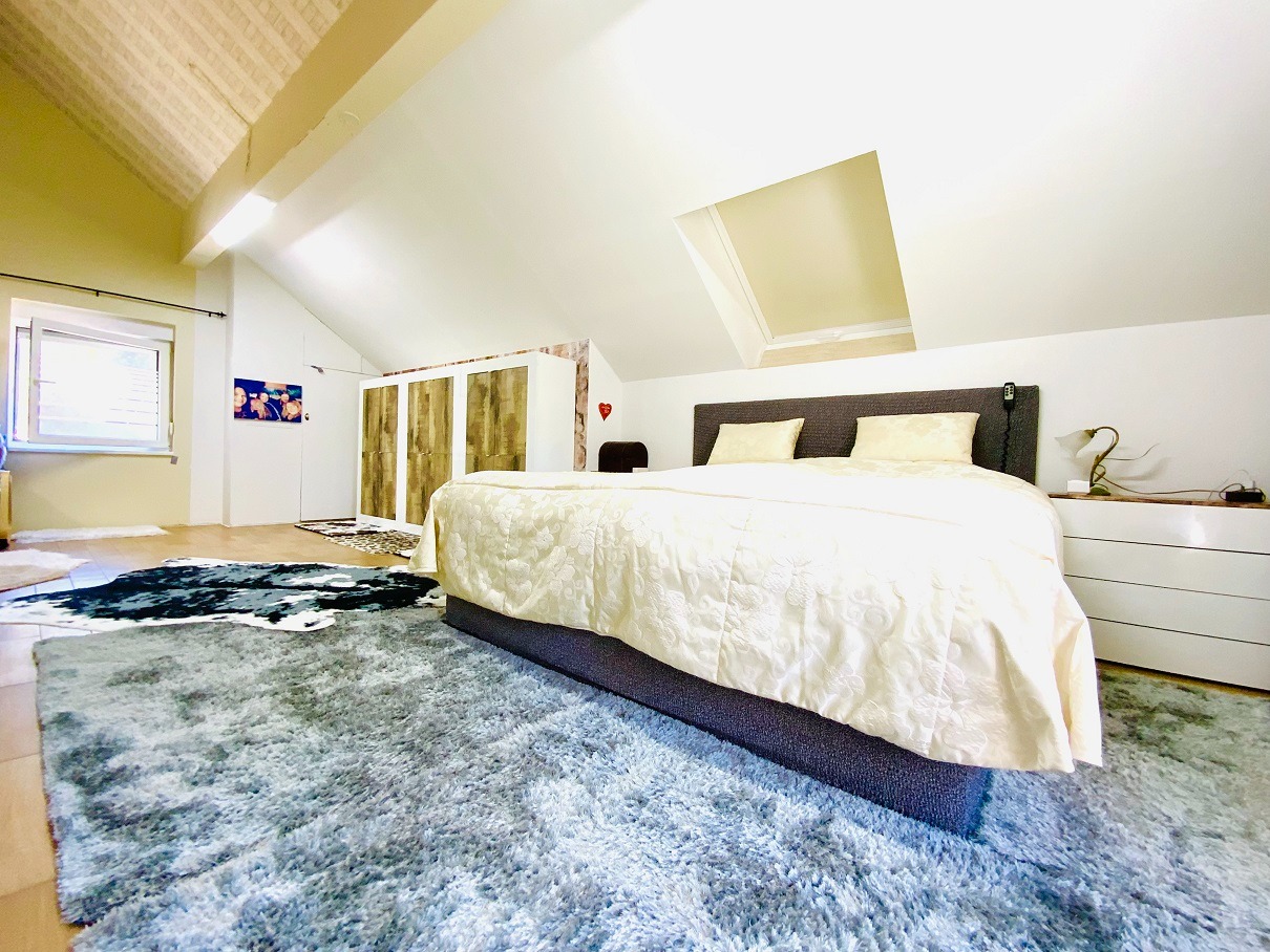 Deze unieke, grote slaapkamer is open tot aan de bovenkant van het dak. Een uniek mooie kamer welke tevens beschikt over een kleedkamer en een badkamer.