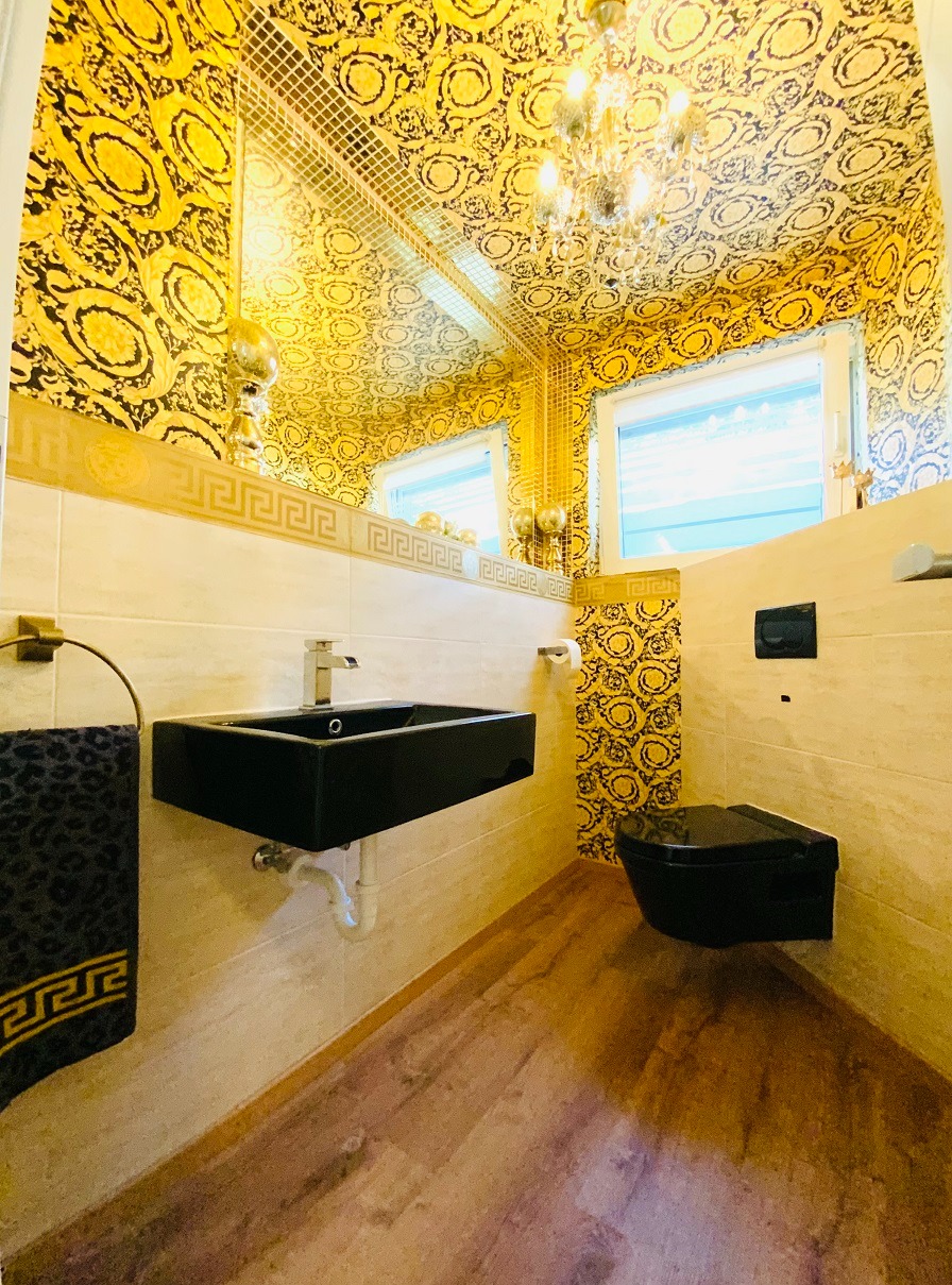 Auf der rechten Seite befindet sich eine große Gästetoilette in einem hochwertigen/modernen Look. Der Raum ist sehr edel gestaltet. Eine große Spiegelfront mit hochwertiger Tapete und schwarzem Sanitär.