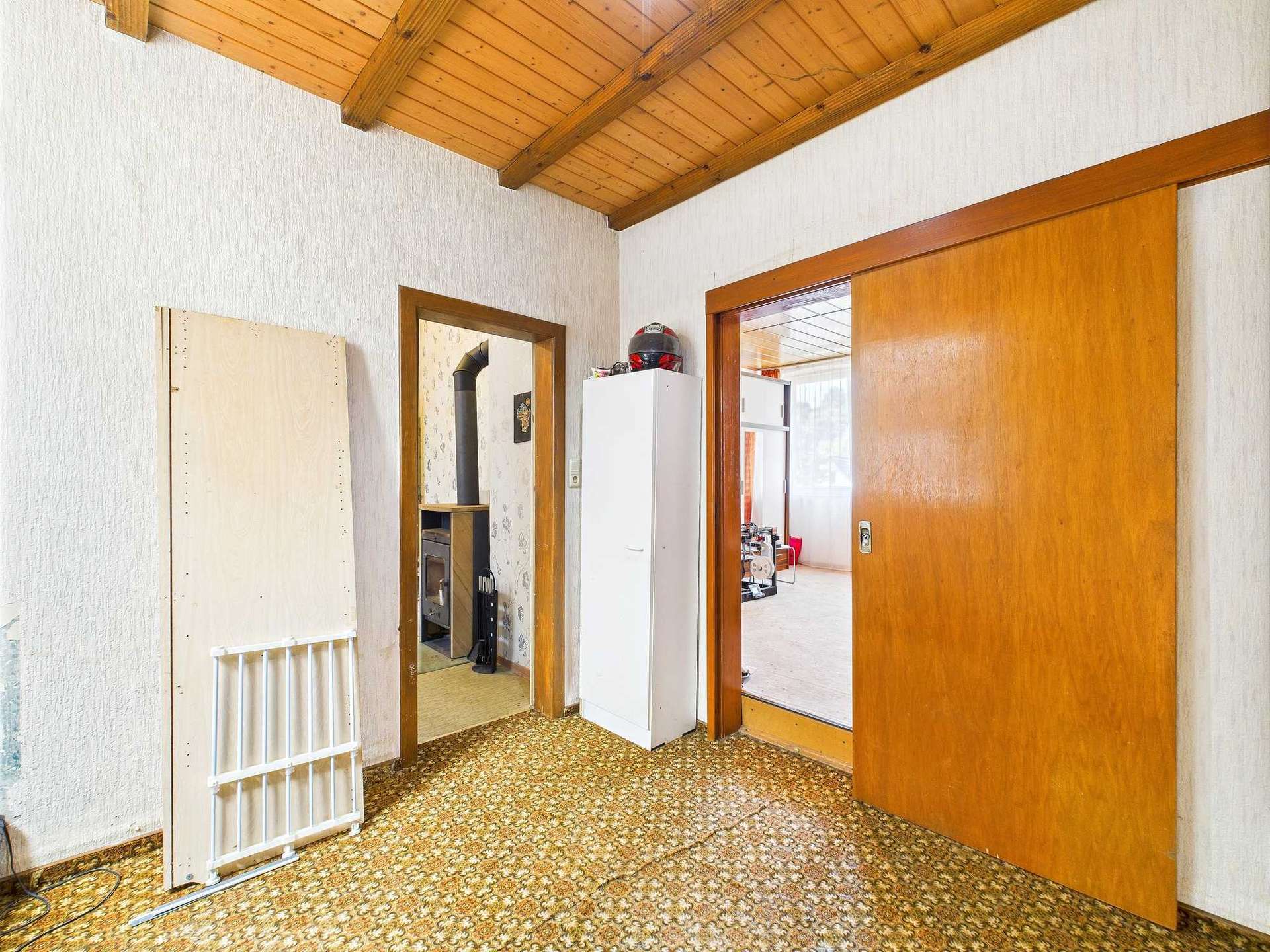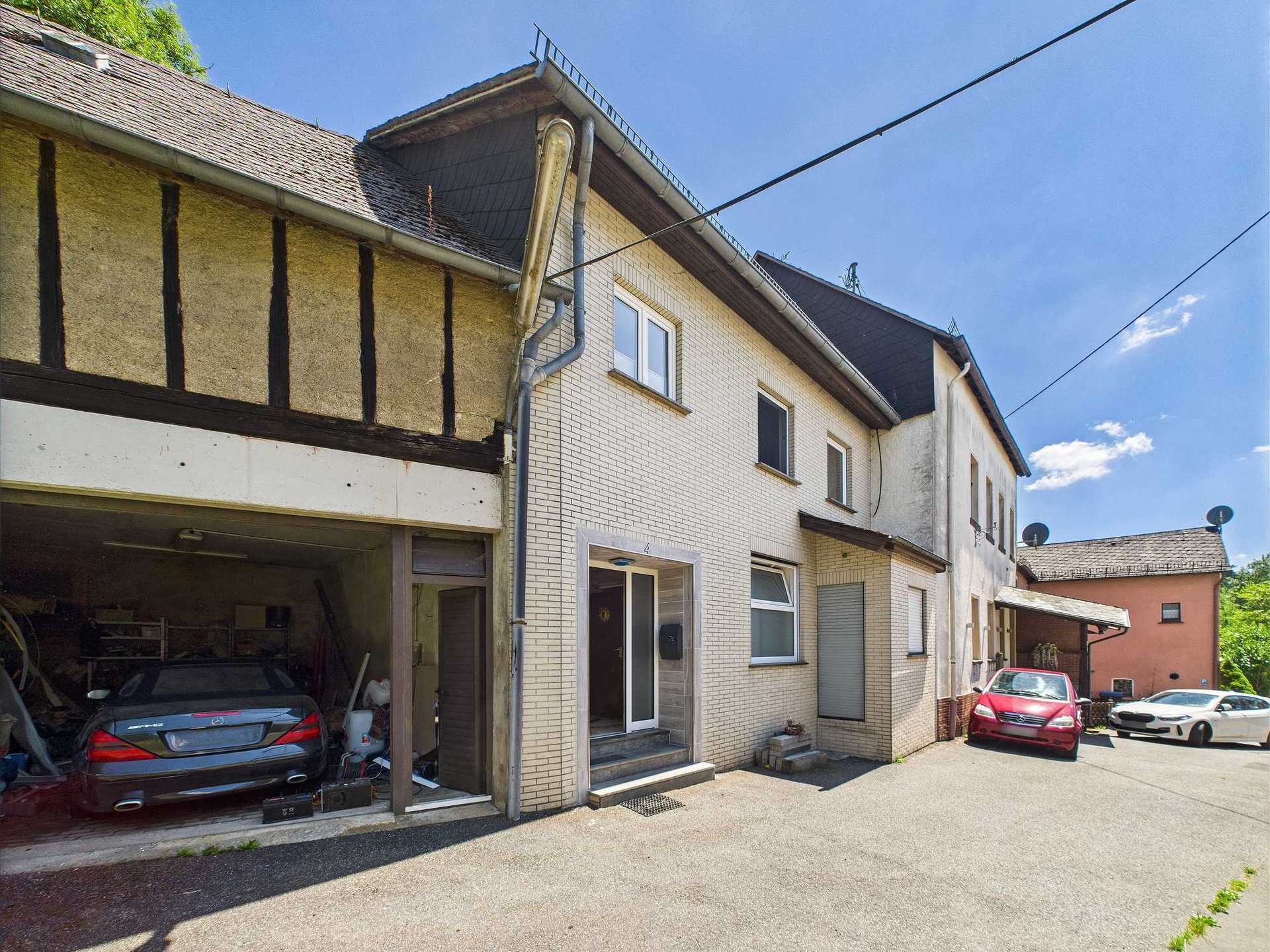 Ein besonderes Plus sind die Nebengebäude: Direkt neben dem Haus befindet sich eine große, ehemals landwirtschaftlich genutzte Scheune, die aktuell als Garage dient. Daneben gibt es eine Stallung, die sich hervorragend zur Unterbringung von Fahrrädern oder Mülltonnen eignet. Für Interessenten mit konkretem Bedarf an Parkflächen bietet sich sogar die Möglichkeit, die Scheune abzureißen und durch zwei moderne Garagen zu ersetzen – entsprechende Genehmigungen vorausgesetzt.