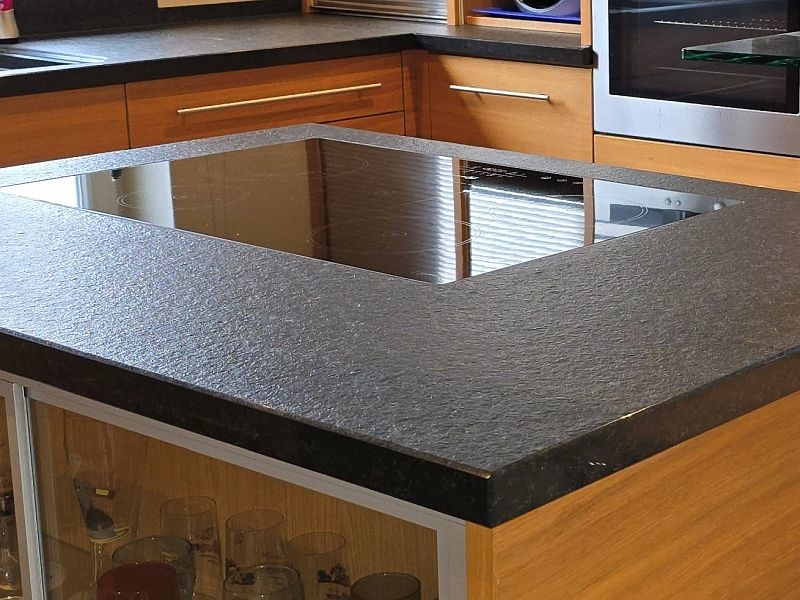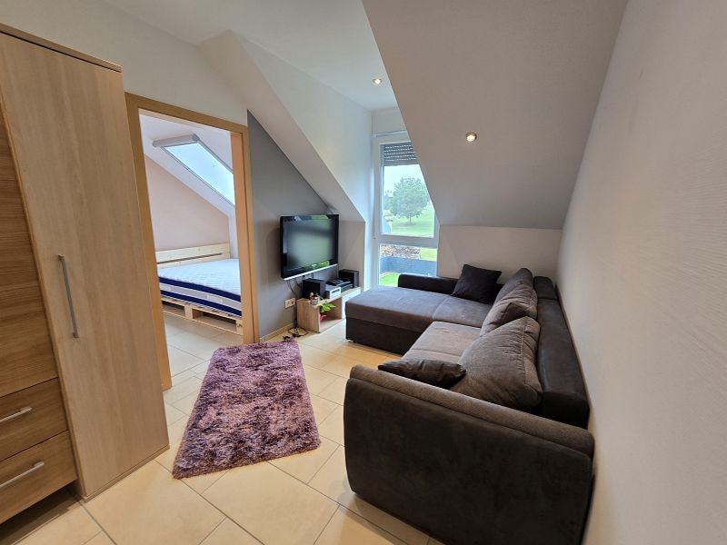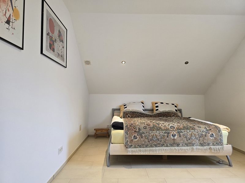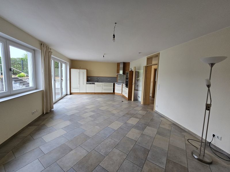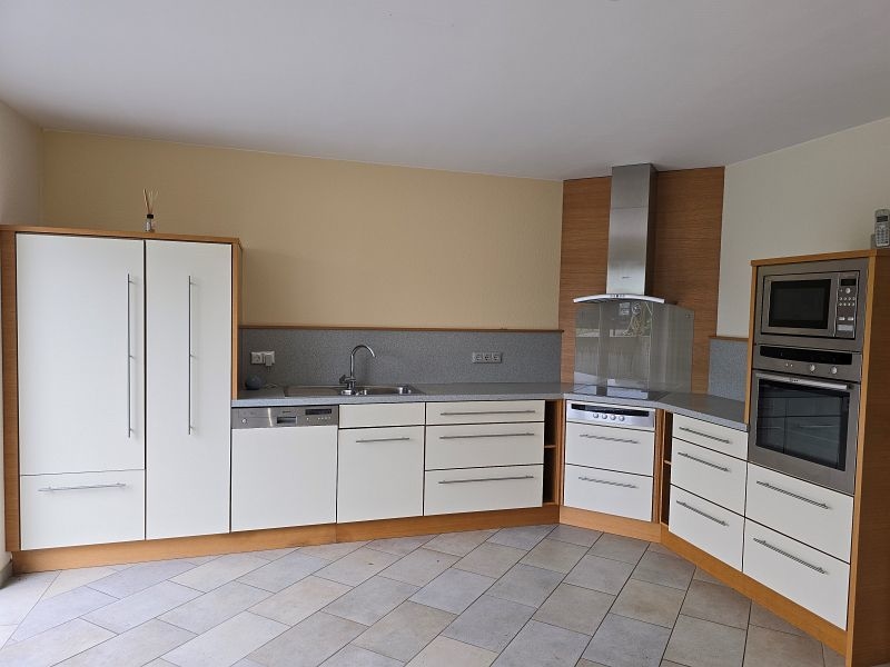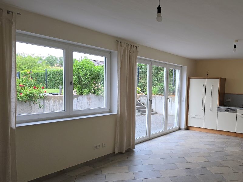 Zwischen Wohnhaus und Garage führt eine Treppe zur ca. 82 m² großen Einliegerwohnung. Die Wohnung verfügt über zwei Schlafzimmer, ein Tageslichtbad mit Dusche und Badewanne, ein Hauswirtschafts- und Stauraum und einen sehr geräumigen Wohn- und Essbereich mit offener Küche inklusive Einbauküche. Von hier aus gelangt man stufenlos auf die große Außenterrasse.