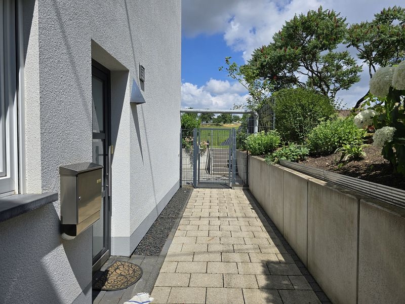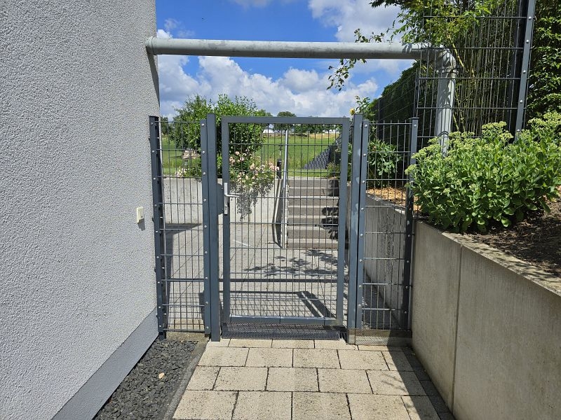 Links am Wohnhaus befindet sich eine verschließbare Zufahrt zum Gartengrundstück hinter dem Haus.