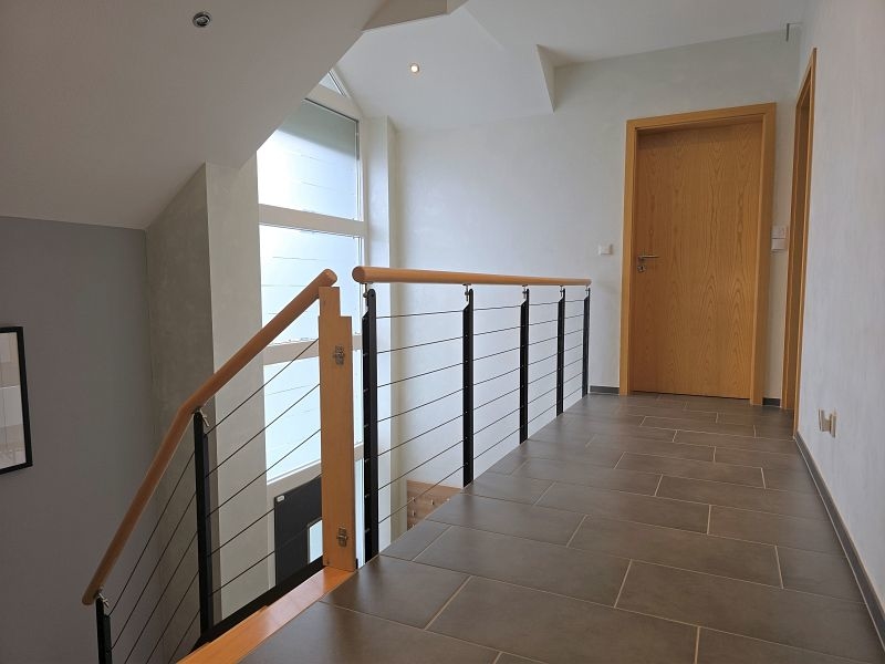 Eine moderne und offene Treppe führt in das Obergeschoss. Durch die offene und moderne Bauweise erreicht man über die lichtdurchflutete Galerie alle Räume dieser Wohnebene. Hier stehen drei Schlafzimmer unterschietlicher Größe, ein Hauswirtschaftsraum und ein Tageslichtbad mit großer begehbarer Dusche und einer sehr geschmackvoll integrierten freistehenden Badewanne bereit.