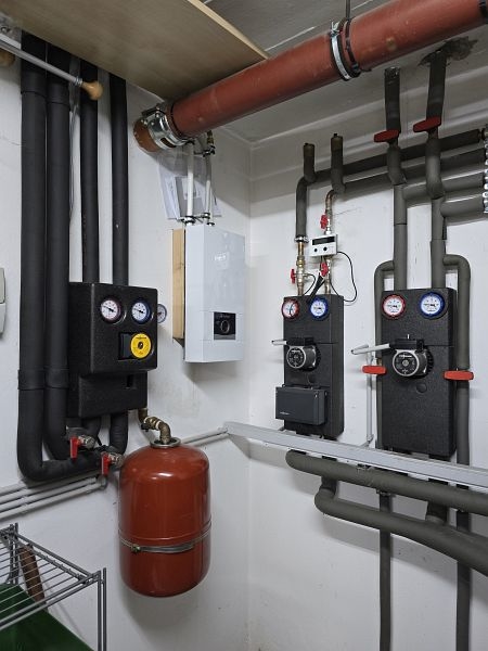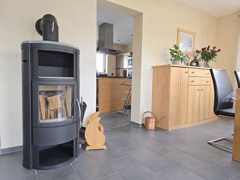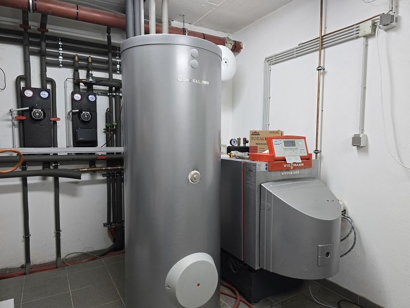 Beheizt wird das Gebäude über eine Öl-Zentralheizung in Kombination mit Fußbodenheizung. Das Warmwasser wird erzeugt über eine Solaranlage.
