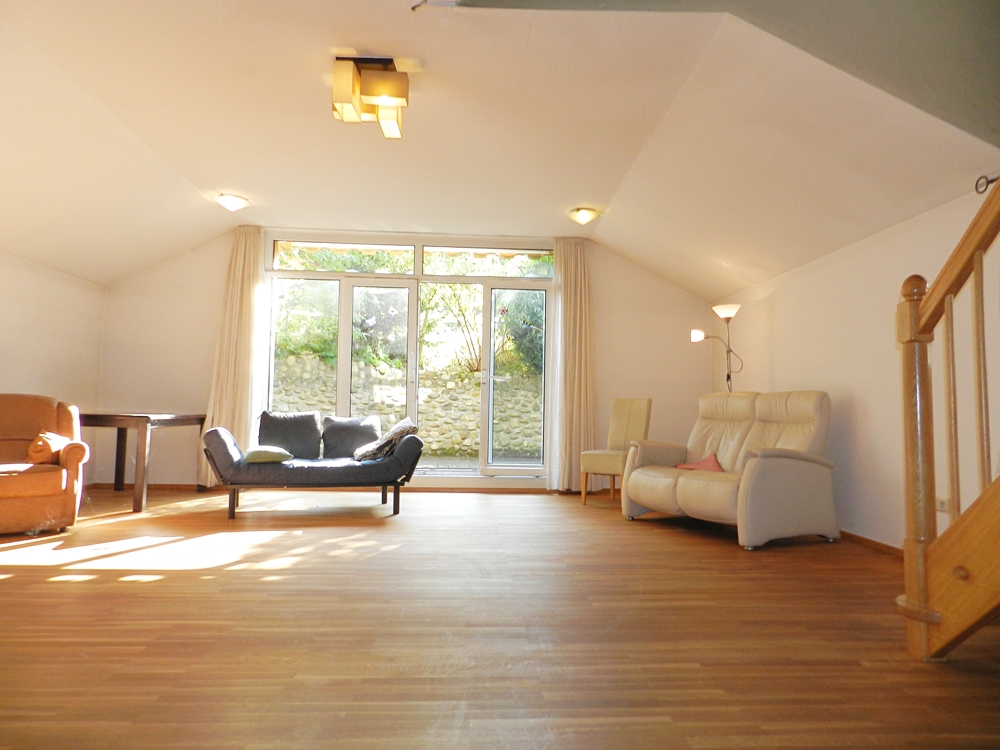 Das großzügige Wohnzimmer mit Echtholzdielen, wasserführendem Kachelofen und Zugang zur Terrasse ist das Highlight dieser Wohnung. Eine geschwungene Holztreppe führt aus dem Wohnzimmer in das 2. OG. Hier erwarten Sie 4 Schlaf-/Kinderzimmer sowie ein Dusch-Bad.
