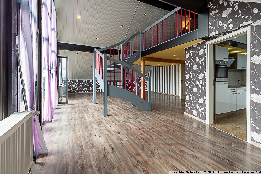 große Diele, nach oben offener Wohn-/Essbereich mit Balkonzugang und Aufgang zur Empore (Schlafbereich), Schlafzimmer mit Ausgang, Küche, Badezimmer mit Doppel-Waschbecken/Eck-Badewanne/Dusche/zwei Fenster, separates WC im Badezimmer