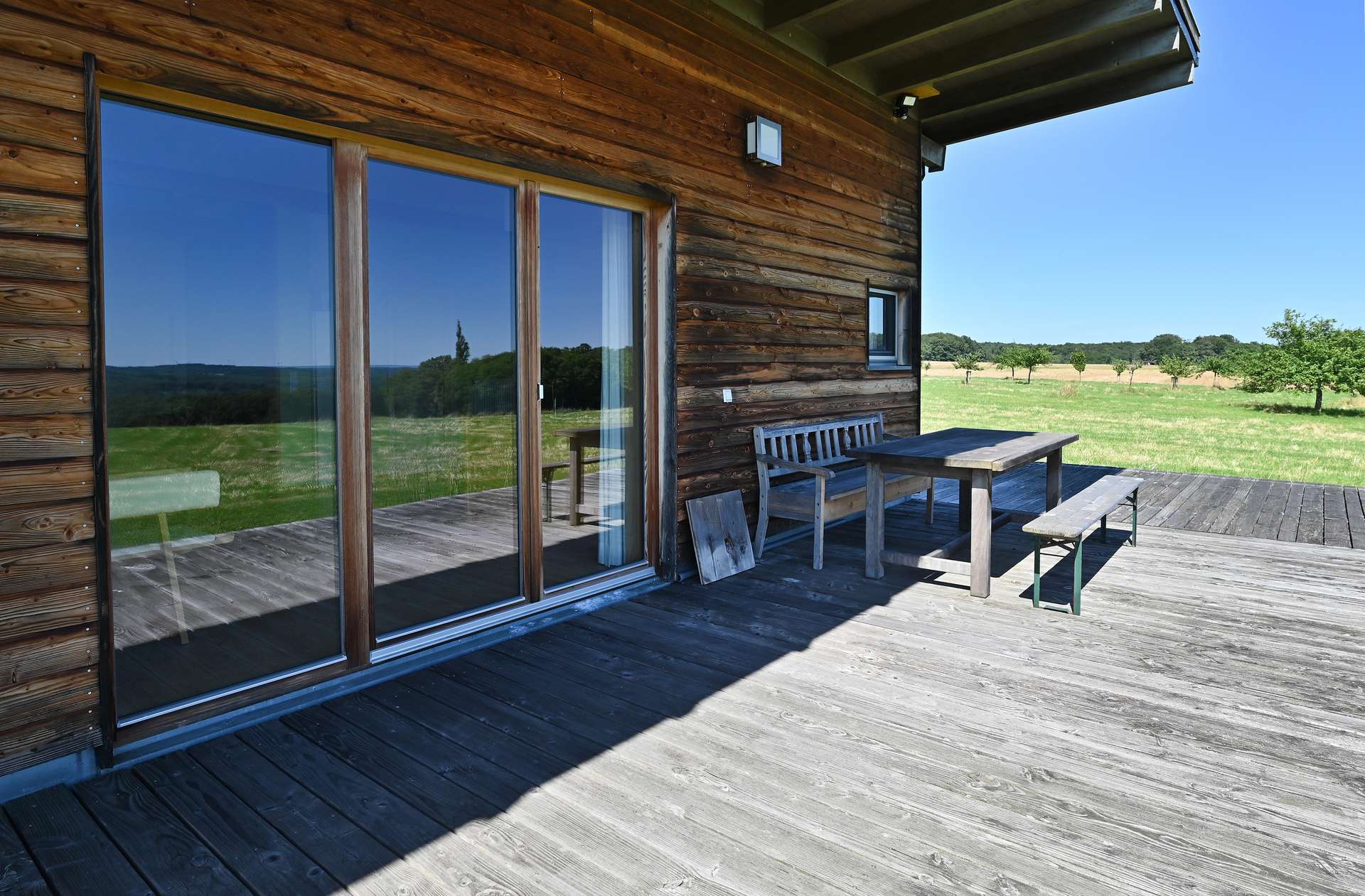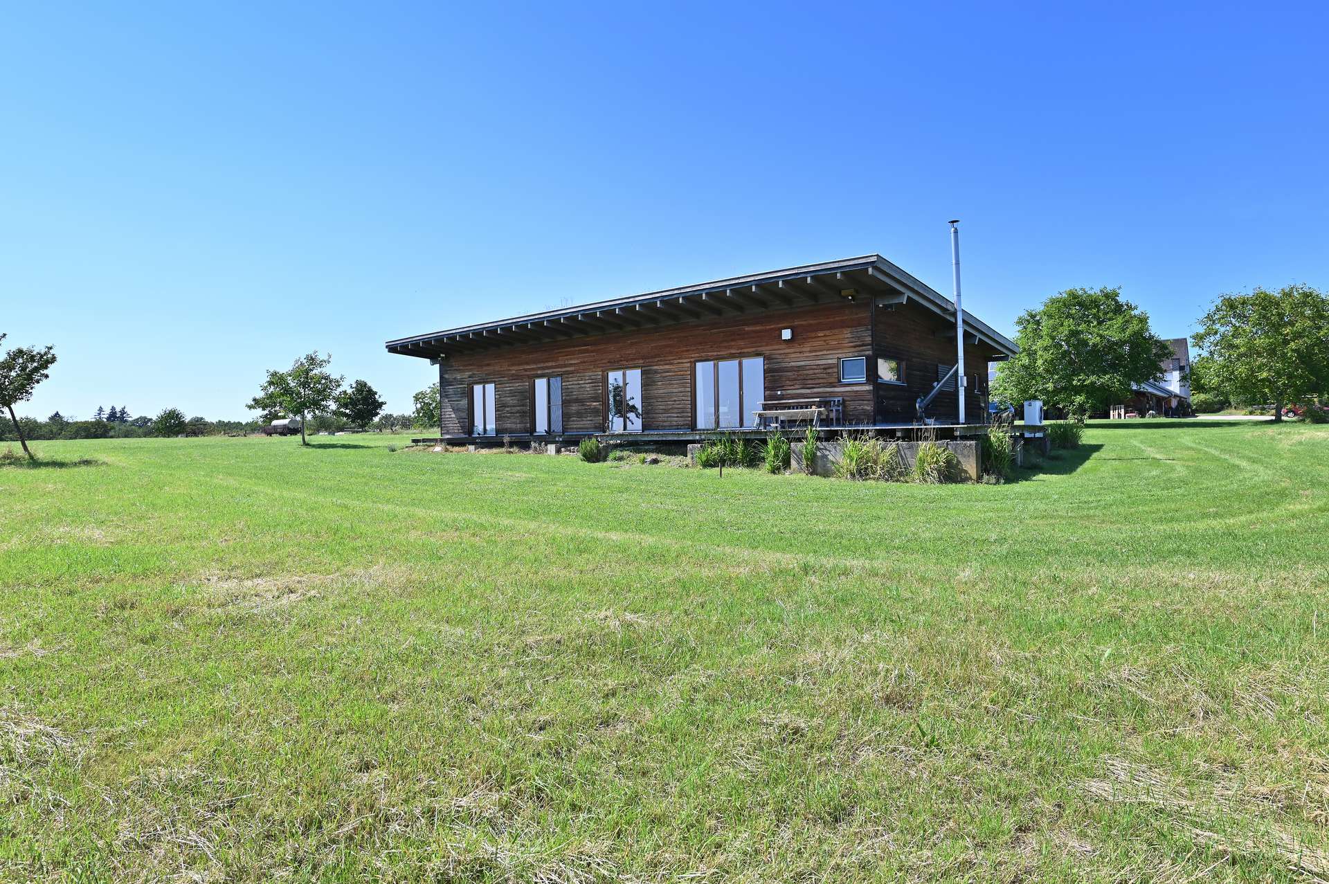 Wer dem hektischen Stadtleben entkommen und sich endlich eine echte Auszeit gönnen möchte, findet in diesem besonderen Zuhause genau das, was er sucht: Ruhe, Ursprünglichkeit und pure Lebensqualität. Dieses charmante Bio-Holzhaus aus dem Jahr 2007 wurde aus unbehandelter Douglasie aus dem Sauerland gefertigt – ein Naturprodukt, das nicht nur durch seine Nachhaltigkeit überzeugt, sondern auch keinerlei Pflegebedarf an der Fassade mit sich bringt. Es altert in Würde und fügt sich harmonisch in die umliegende Landschaft ein.
