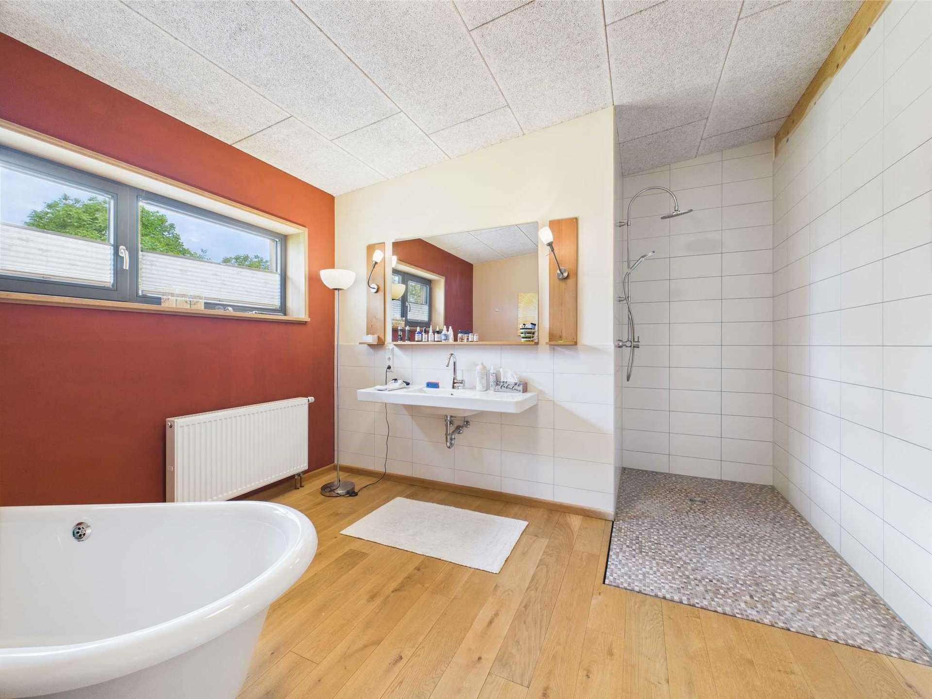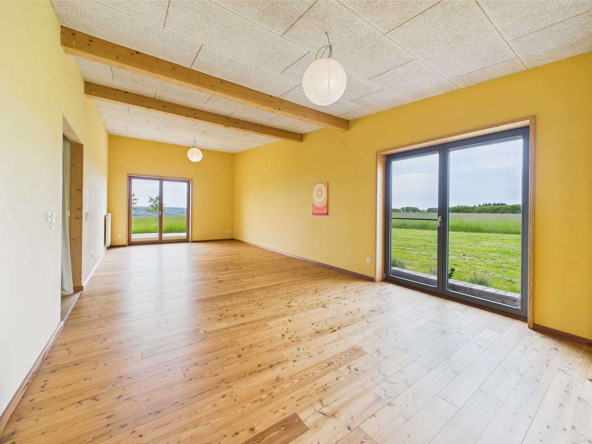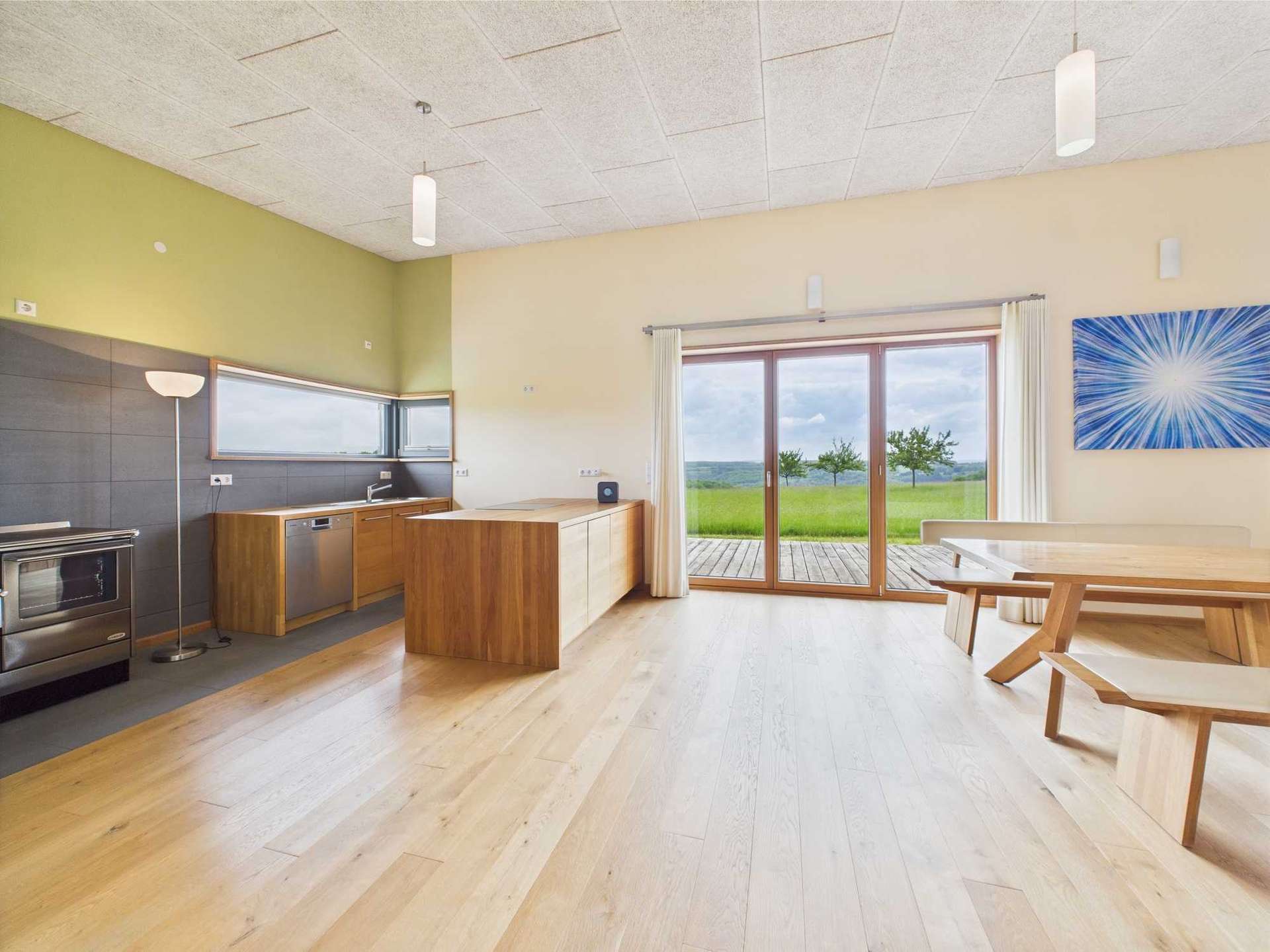 Im Inneren des Hauses empfängt Sie eine einladende Diele, von der aus Sie in den weitläufigen und lichtdurchfluteten Wohn-, Ess- und Küchenbereich gelangen. Durch große Fensterfronten genießen Sie zu jeder Tageszeit den Blick ins Grüne – ein Wohnzimmer, das zur Ruhe einlädt und gleichzeitig die Natur ins Haus holt. Hinter dem Haus lädt eine Terrasse zum Verweilen ein – mit etwas Glück lassen sich hier sogar Rehe beobachten. Mehr Verbindung zur Natur geht kaum.