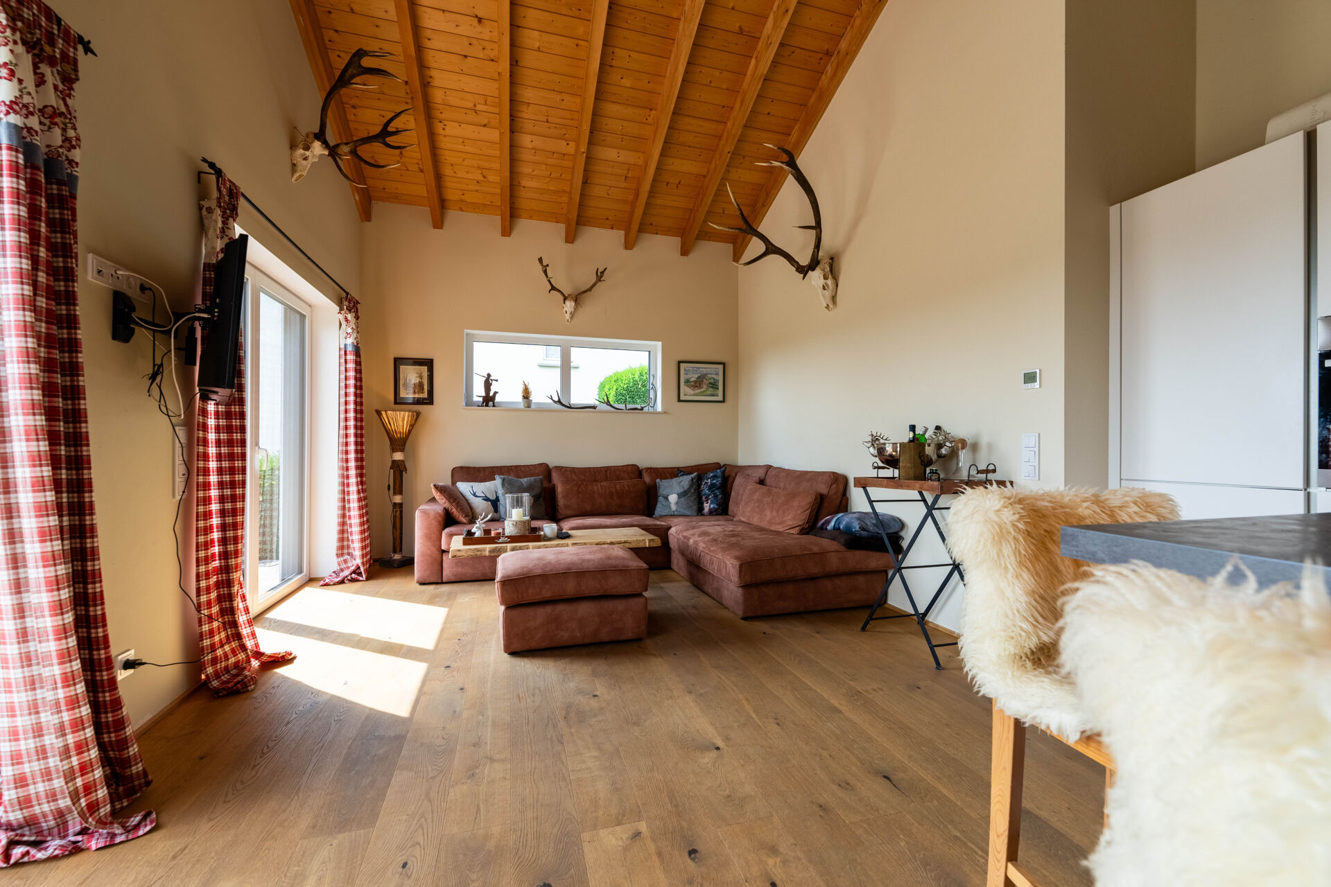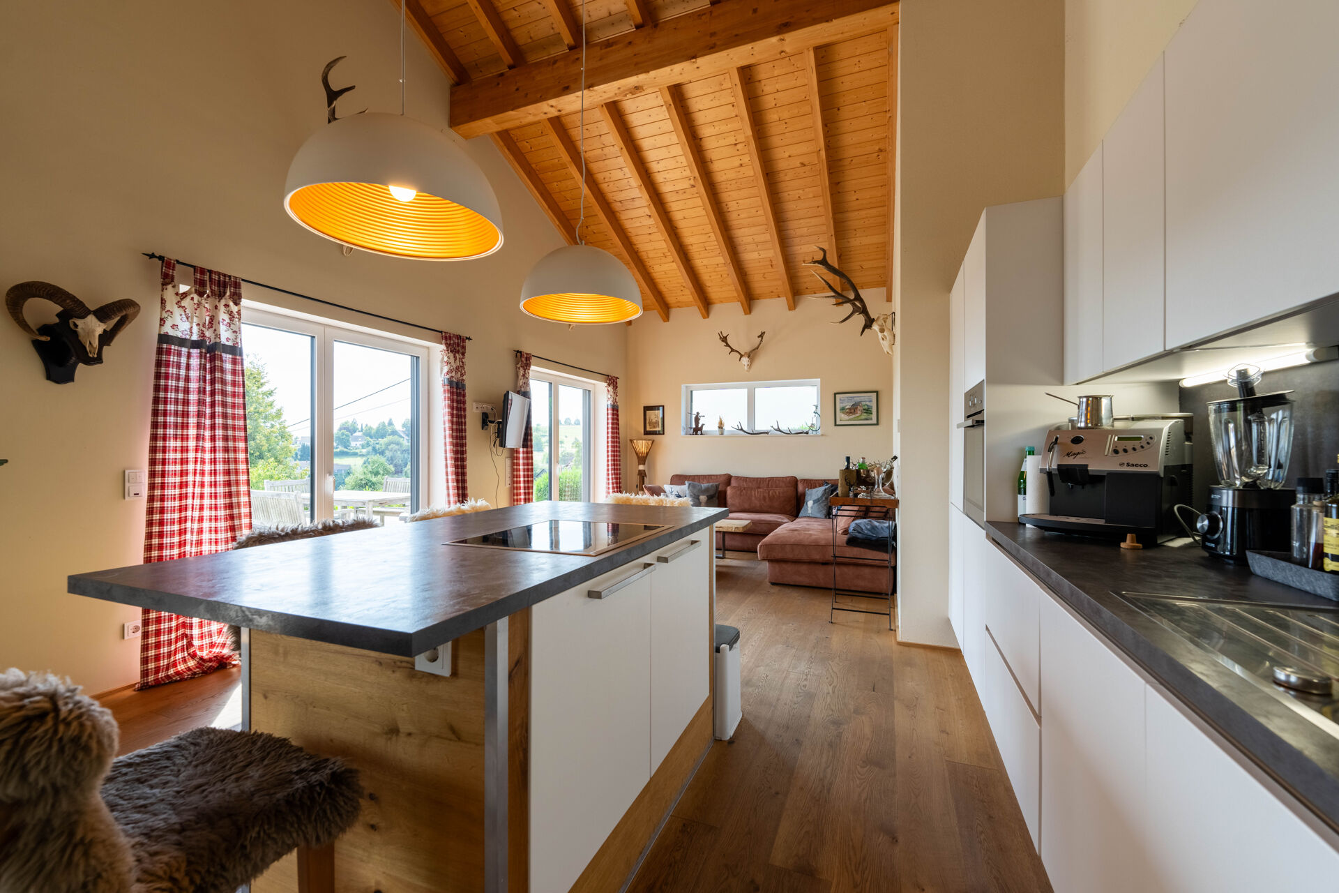 Der großzügige Wohn- und Essbereich öffnet sich zur großzügigen Terrasse, von der aus Sie die herrliche Aussicht genießen können. Die zusätzliche Empore bietet vielfältige Nutzungsmöglichkeiten – ob als Arbeitsbereich, Galerie oder Rückzugsort.