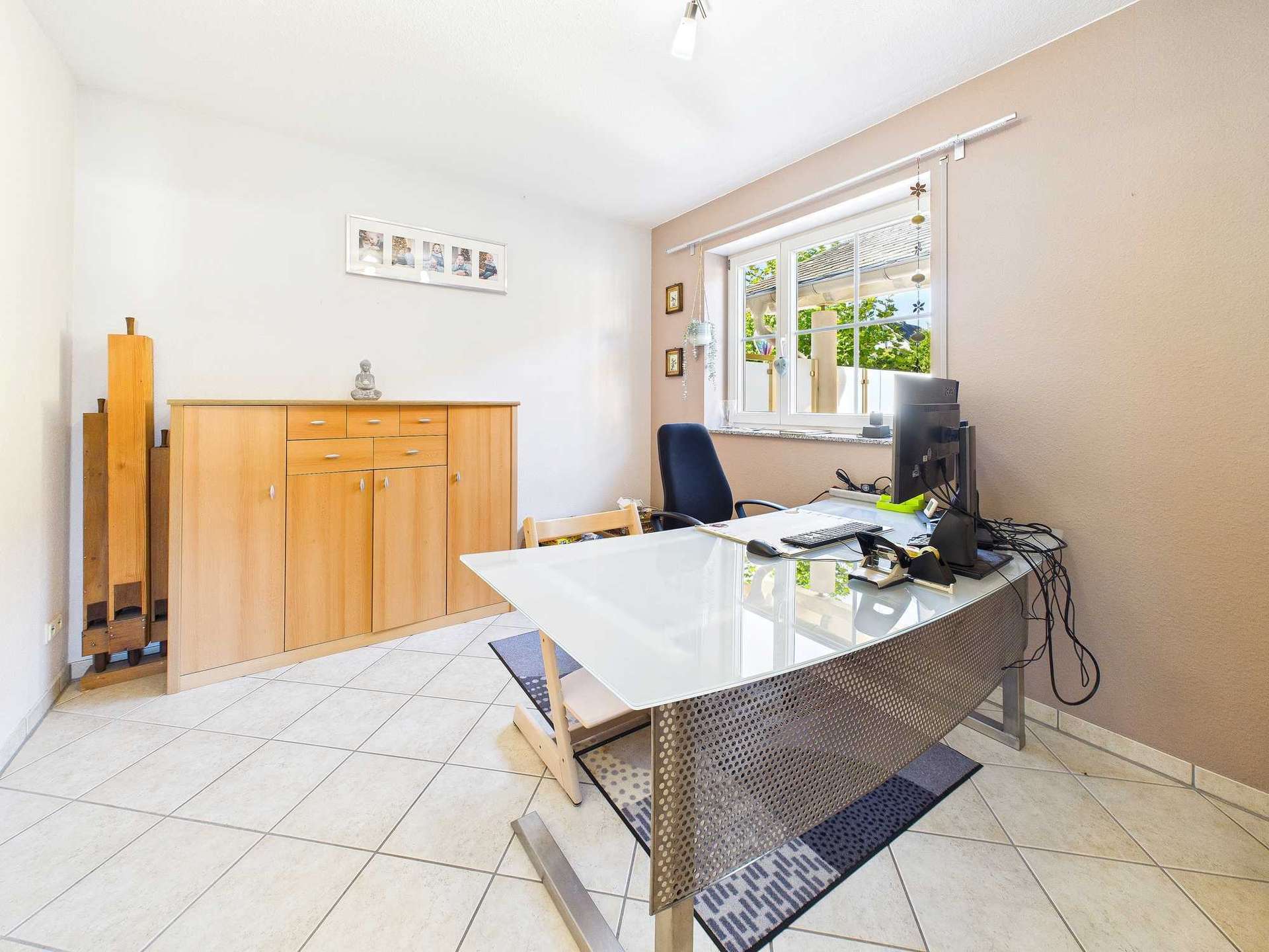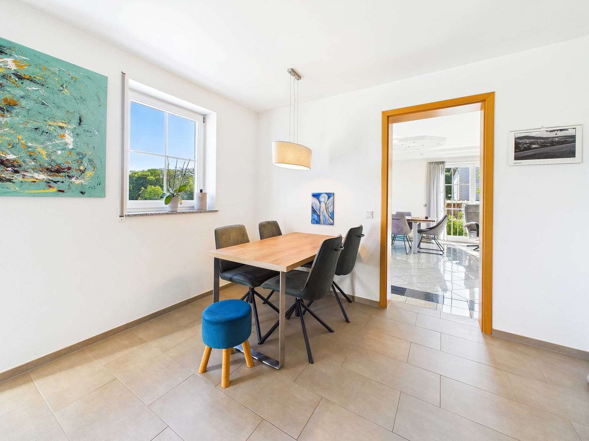 Mit einer Wohnfläche von ca. 190 m² in der Hauptwohnung bietet das Haus ausreichend Platz für eine größere Familie, für Mehrgenerationenwohnen oder auch für die Kombination von Wohnen und Arbeiten. Im Erdgeschoss erwartet Sie ein großzügiges Wohn- und Esszimmer, das durch seine Helligkeit und Offenheit besticht. Die angrenzende Küche ist ebenfalls sehr großzügig bemessen, verfügt über einen praktischen Abstellraum und bietet Zugang zu einem Balkon – ideal für kurze Wege zwischen Innen- und Außenbereich. Ein zusätzliches Büro, das ebenso als Gäste- oder Hobbyzimmer genutzt werden kann, sowie ein Gäste-WC komplettieren diese Ebene.