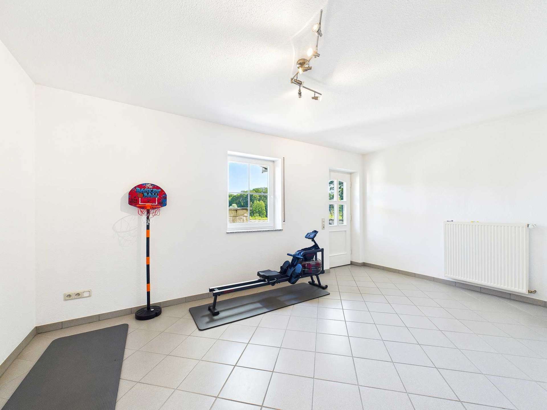 Ergänzt wird das Raumangebot durch die unterkellerte Garage, ein Carport sowie zwei weitere Außenstellplätze. Der Nebeneingang führt in den Kellergeschossbereich, wo zur Hauptwohnung zusätzliche Abstell- und Funktionsräume gehören. Neben dem Hauswirtschaftsraum mit Dusche und Waschmaschinenanschluss befindet sich hier auch ein beheizter Hobbyraum mit separatem Außenzugang. Dieser Raum eignet sich ideal als Büro, um Kunden zu empfangen, ohne die privaten Wohnräume betreten zu müssen. Sämtliche Anschlüsse für eine Küche sind vorhanden, sodass der Raum alternativ auch als eigenständige Wohneinheit genutzt oder über einen Durchbruch an die Einliegerwohnung angeschlossen werden könnte.