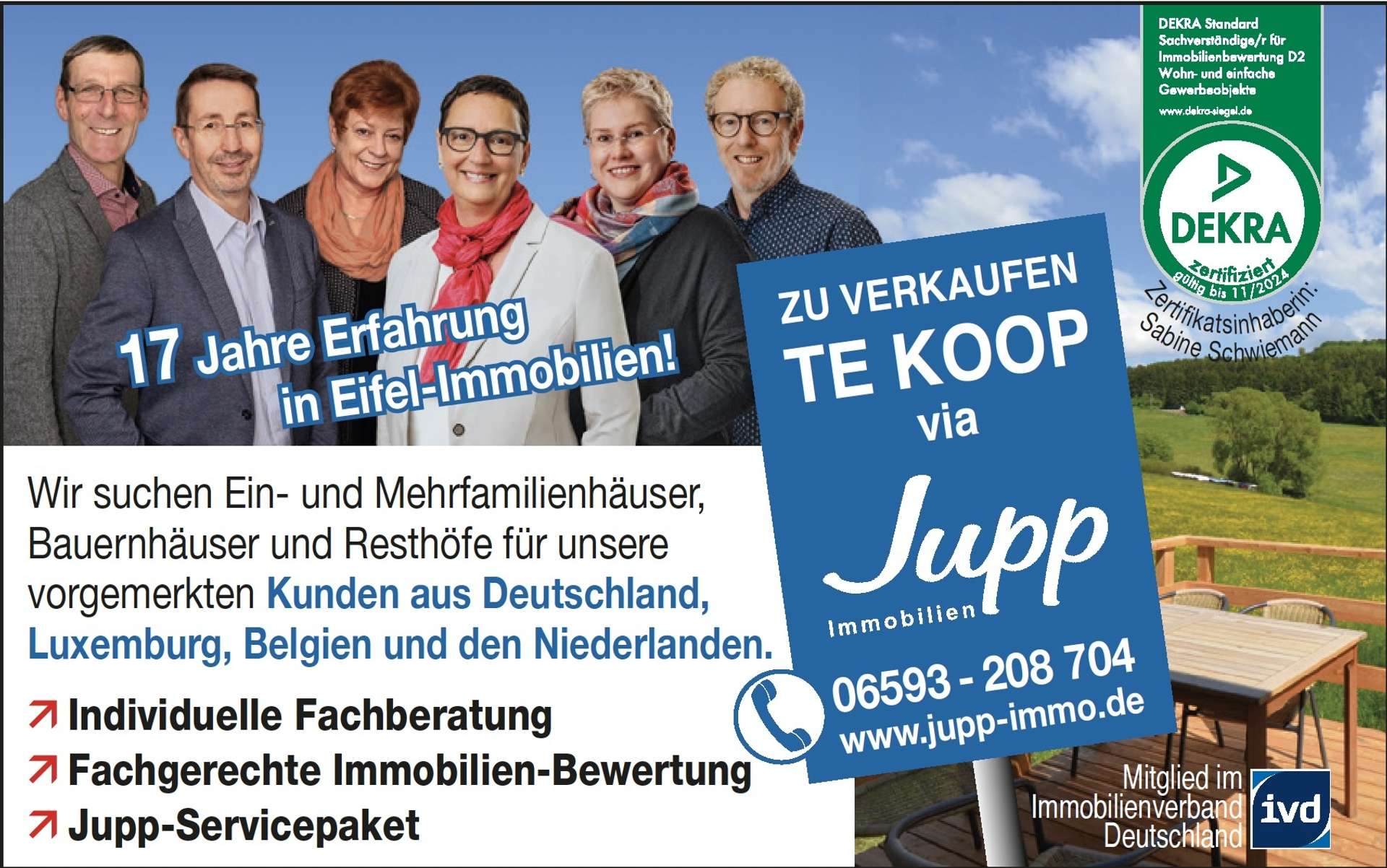 Dieses schöne EFH mit ELW wurde 1965 in Massivbauweise errichtet und steht in wunderbarer Höhenlage in einer ruhigen Wohnstraße ohne Durchgangsverkehr oberhalb den Dächern von Jünkerath. Vom Garten, Terrasse und Balkon aus hat man einen schönen Blick über das Obere Kylltal.