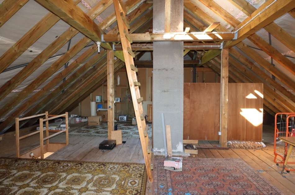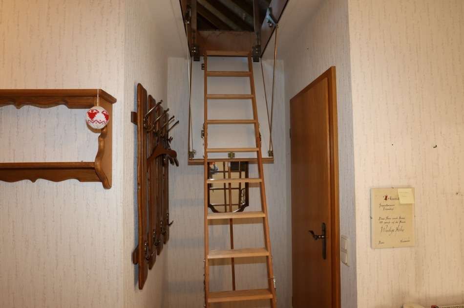 De zolder is bereikbaar via een uitschuifbare ladder en biedt extra bergruimte. De aparte, grote garage naast het huis biedt voldoende ruimte voor een kleine werkplaats. Het verharde terrein voor de garage biedt ook extra parkeergelegenheid voor auto’s.