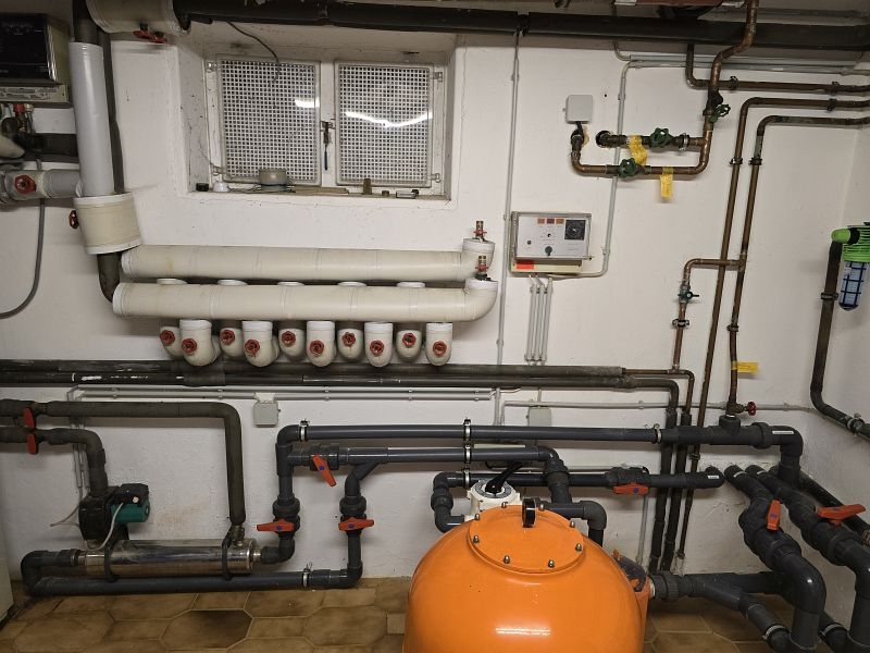 De bestaande oliegestookte verwarming kan, afhankelijk van het seizoen, worden ingeschakeld om het buitenzwembad sneller te verwarmen.